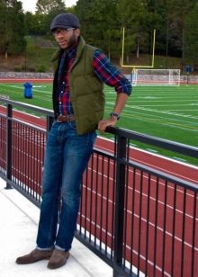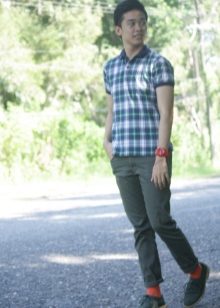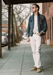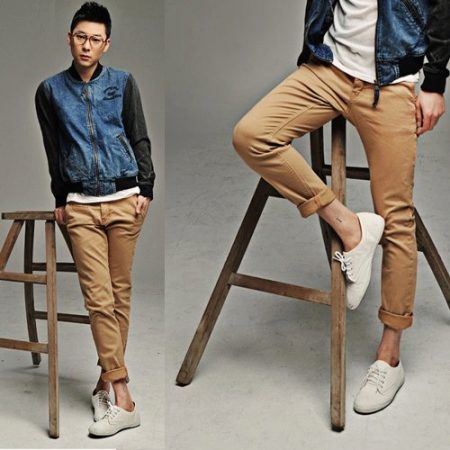 กางเกงขายาวสีน้ำตาลอ่อน + เสื้อบอมเบอร์ยีนส์ + เสื้อกล้ามสีขาว + รองเท้าหนังกลับสีขาว แล้วปิดจ๊อบด้วยแว่นตาและแอ็กเซสซอรี่นิดหน่อย ลุคนี้ดูหนุ่มและชิลมาก