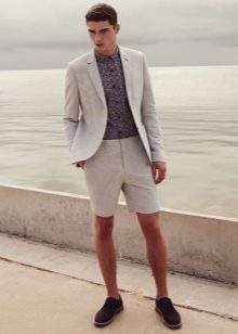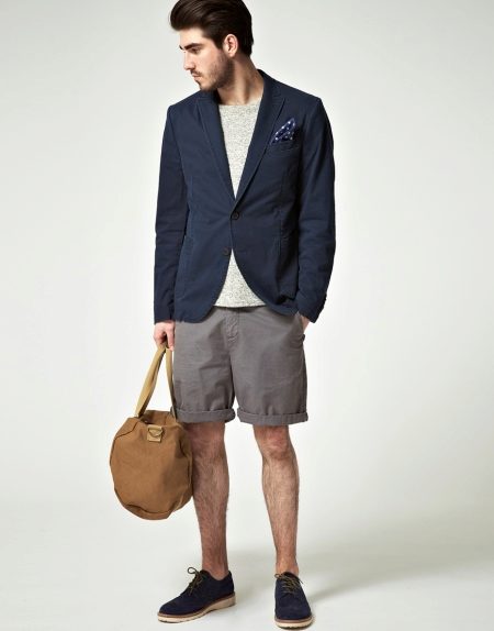 กางเกงขาสั้นสีเทา + เสื้อกล้ามสีอ่อน + แจ็คเก็ตสีน้ำเงินเข้ม + รองเท้าหนังกลับสีน้ำเงิน เติมด้วยกระเป๋าสีน้ำตาลอ่อน ได้ลุคหนุ่มเมืองที่ดูสบายแต่มีดีเทล