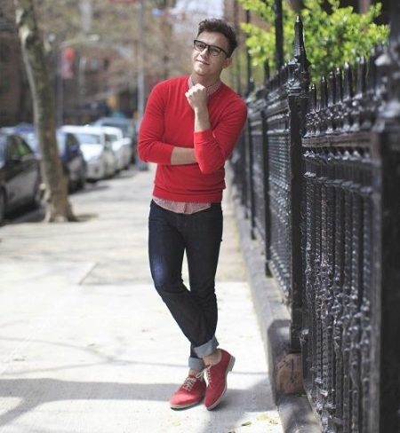 รองเท้าหนังกลับสีแดง + เชือกผูกรองเท้าสีขาว + กางเกงยีนส์สีน้ำเงินเข้ม + เสื้อสเวตเตอร์สีแดง + เสื้อเชิ้ตด้านใน แล้วปิดด้วยแว่นกรอบดำ ลุคนี้เด่นแต่ยังดูมีโครงสร้าง