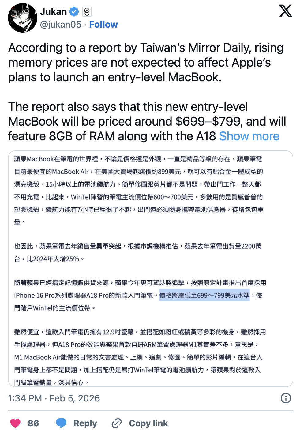 ตามรายงานของ Mirror Daily จากไต้หวัน