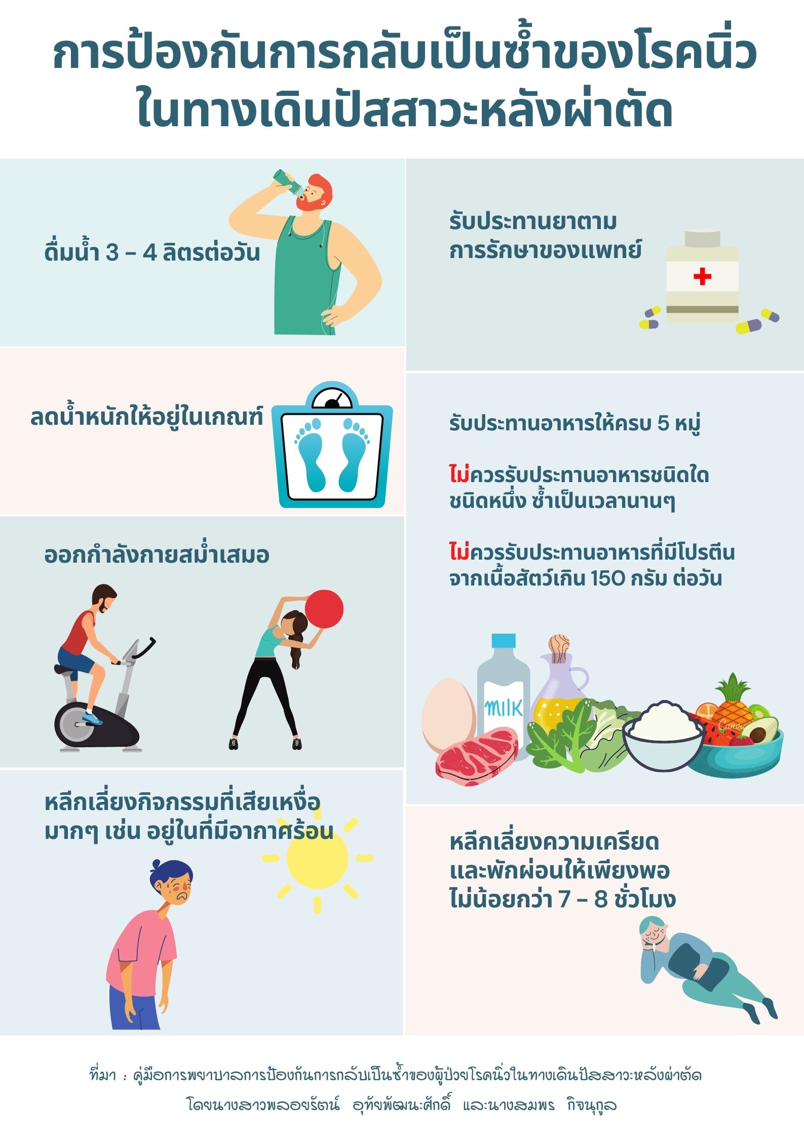 หลังผ่าตัดนิ่ว ถ้าไม่ดูแลตัวเองดีพอ ก็มีโอกาสที่นิ่วจะกลับมาใหม่ได้ ภาพอินโฟกราฟิกนี้ช่วยสรุปหลักการดูแล เพื่อช่วยลดโอกาสเกิดซ้ำ
