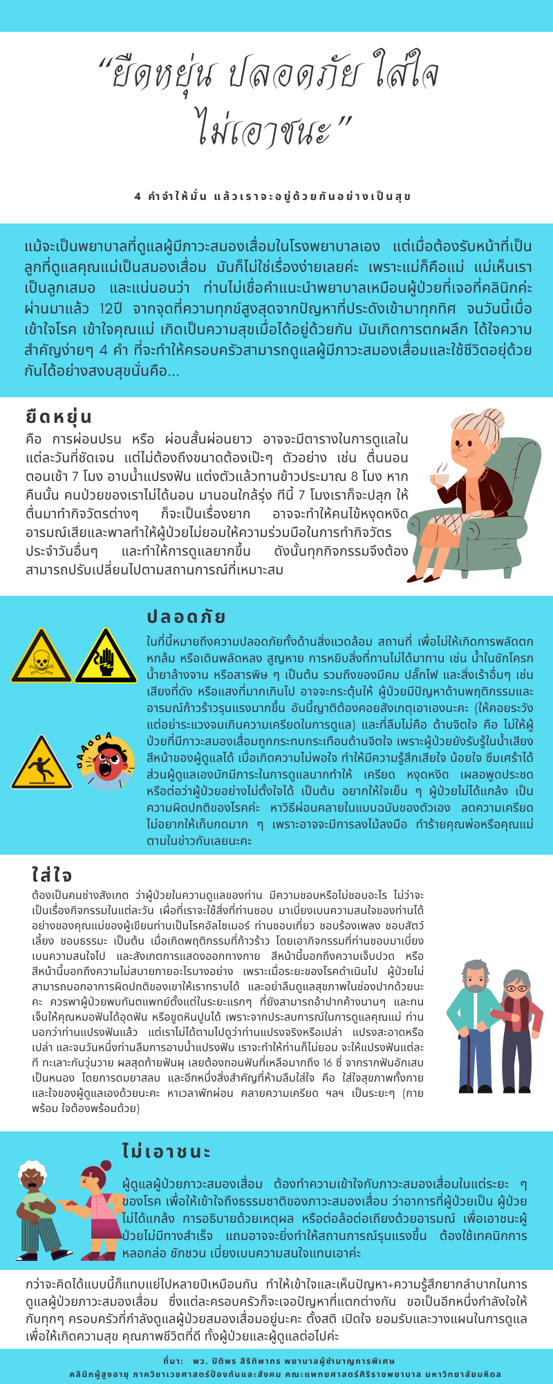 ยืดหยุ่น – ปลอดภัย – ใส่ใจ – ไม่เอาชนะ คือ 4 คีย์เวิร์ดที่ช่วยให้การดูแลผู้สูงอายุที่มีภาวะสมองเสื่อมเป็นมิตรมากขึ้น ทั้งต่อผู้ป่วยและผู้ดูแล