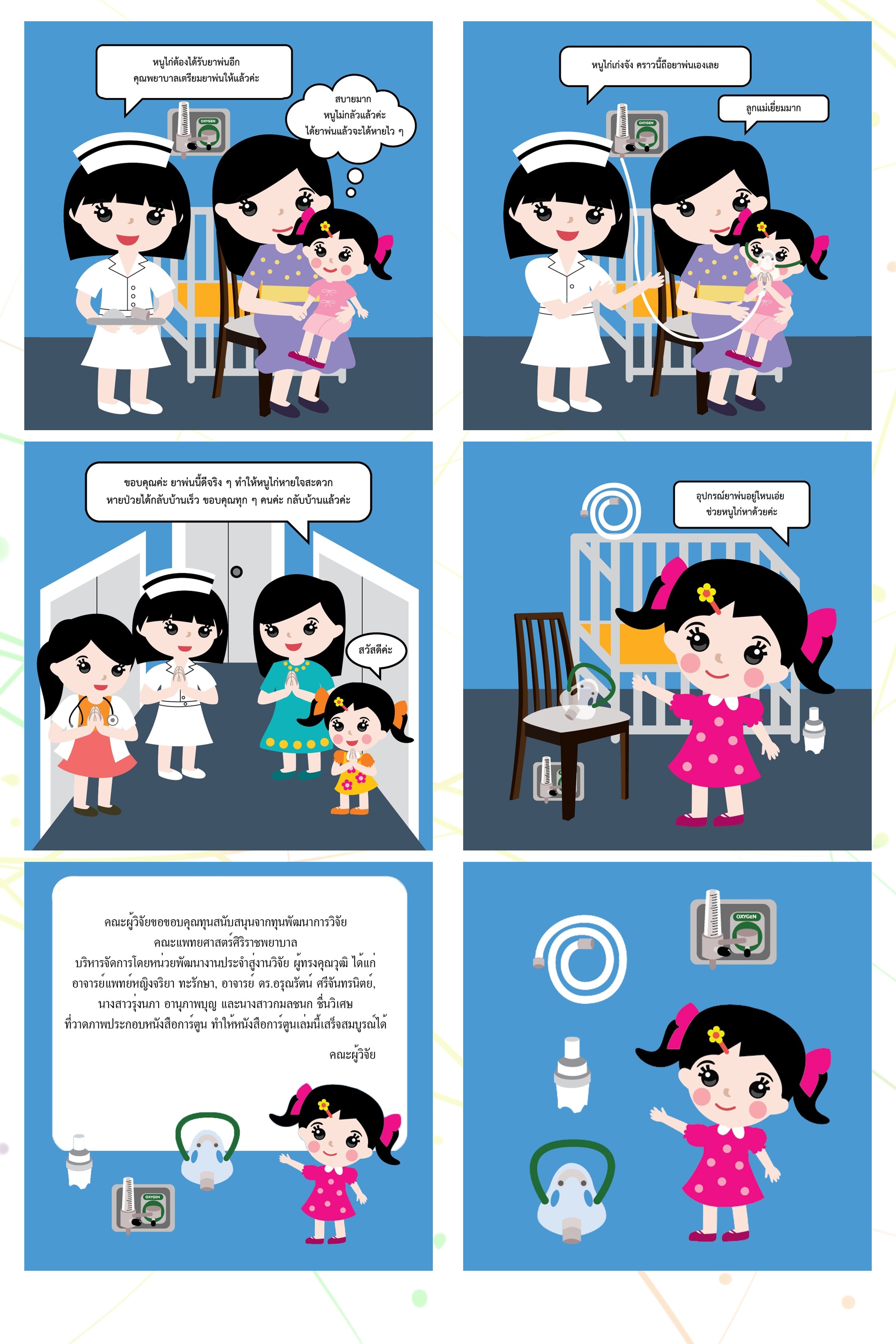 เด็กเล็กหลายคนกลัวเสียงและหน้าตาของยาพ่นฝอยละออง การใช้หนังสือการ์ตูนช่วยเล่าเรื่อง ให้เด็กคุ้นเคยและเข้าใจว่าการพ่นยาเป็นเรื่องช่วยรักษา ไม่ได้น่ากลัวอย่างที่คิด