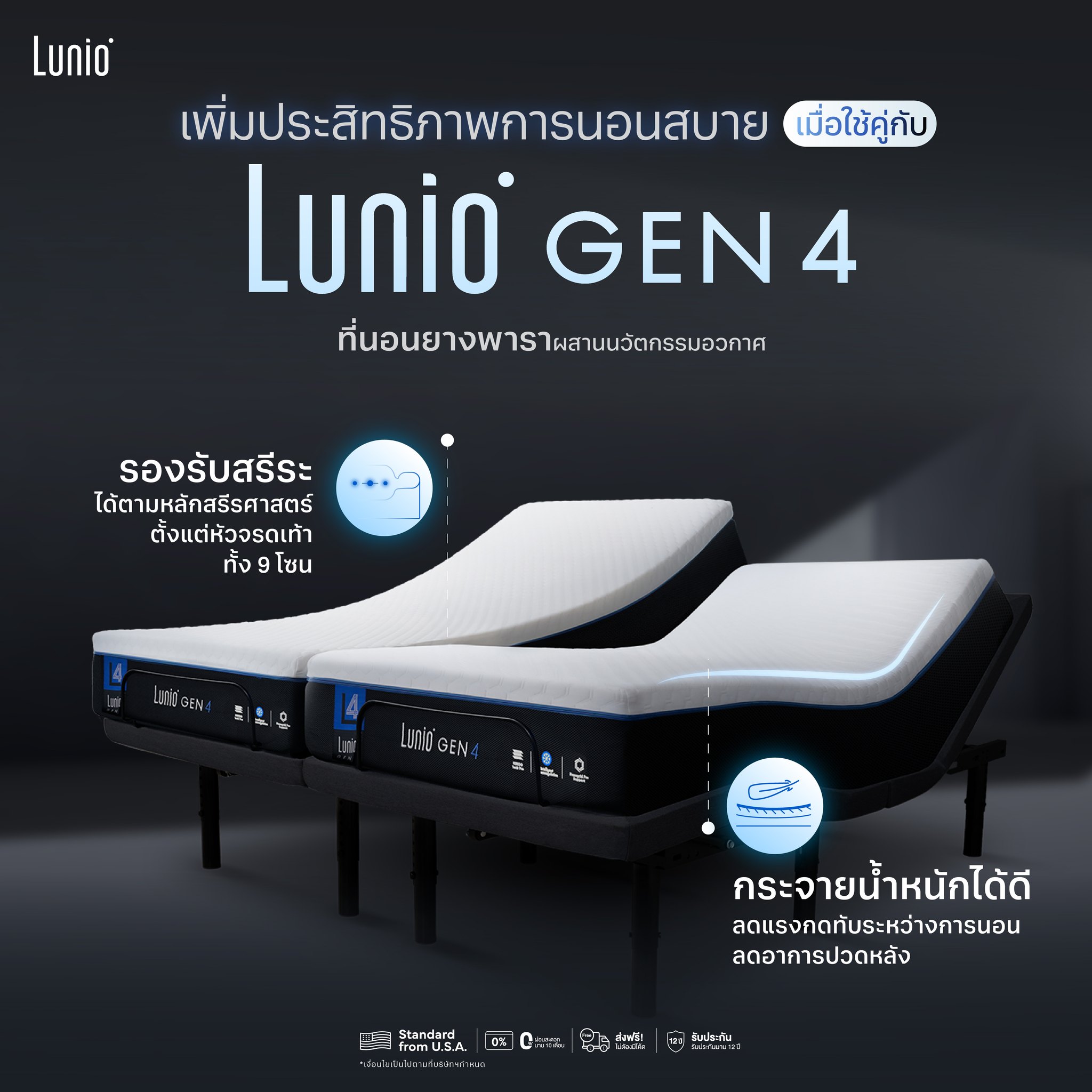 Lunio Smart Rise Adjustable Bed + ที่นอน Lunio Gen4 คือการผสานเทคโนโลยีอวกาศ วัสดุพรีเมียม และระบบดูแลสุขภาพ 5 โหมด เข้าด้วยกันอย่างสมบูรณ์แบบ