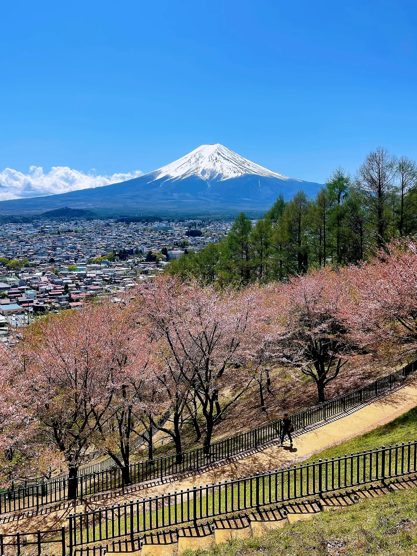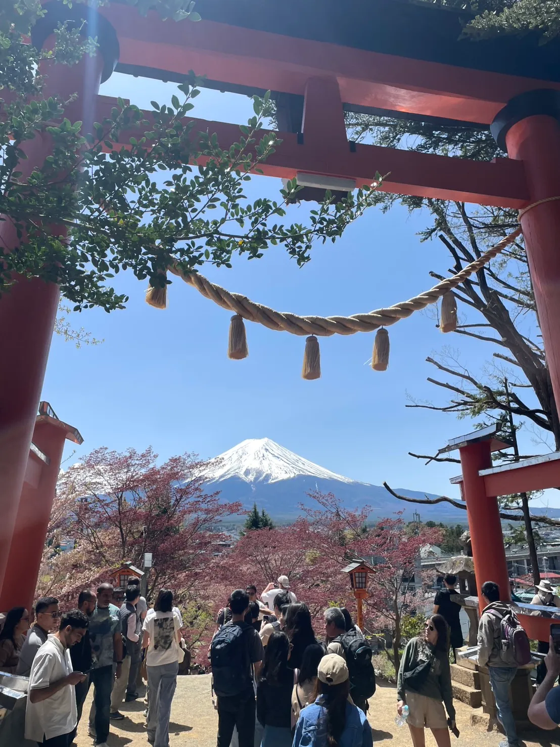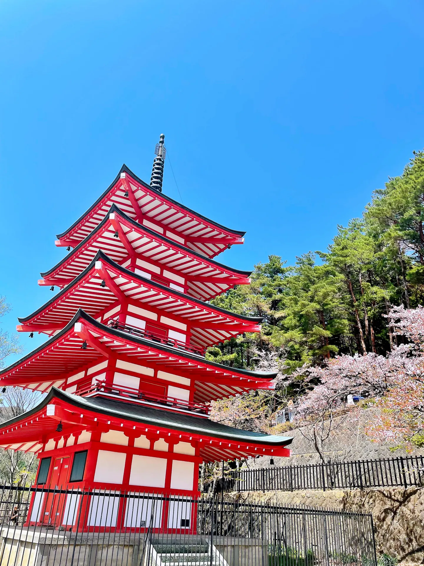 ที่นี่คือ เจดีย์แดง 5 ชั้น Chureito Pagoda มุมถ่ายรูประดับไอคอนนิค เห็นเจดีย์ด้านหน้า และ ฟูจิตั้งเด่นอยู่ด้านหลัง ถ้าไปช่วงกลางเมษายน ซากุระจะเรียงรายสองฝั่งทางเดินขึ้นบันได สวยเหมือนภาพวาด