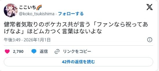 ในโพสต์นั้นปรากฏภาพ ตุ๊กตา Yuki Setsuna ถูกทำลายจนเละ และถูกจุดไฟเผาจนวอด พร้อมข้อความสื่อถึงอาการ “รับไม่ได้” กับการแต่งงานของนักพากย์ที่ตนรัก
