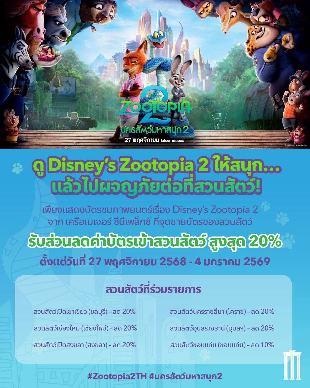 แต่… ความสนุกยังไม่จบแค่ในโรงนะ เพราะเมเจอร์ ซีนีเพล็กซ์ ส่งโปรสุดชุ่มชื่นหัวใจมาให้ทุกคนได้ต่อทริปหลังดูหนังทันที! แค่เก็บตั๋วหนัง Zootopia 2 เอาไว้ ก็สามารถนำไปแลกส่วนลดค่าบัตรเข้าสวนสัตว์เปิดเขาเขียว สูงสุดถึง 20% เลยทีเดียว แถมใช้ได้ตั้งแต่วันที่ 27 พฤศจิกายน 2568 - 4 มกราคม 2569 เรียกว่าดูหนังเสร็จ แล้วไปลุยสวนสัตว์ต่อได้แบบไม่มีพัก ฟีลโคตร Zootopia สมชื่อ