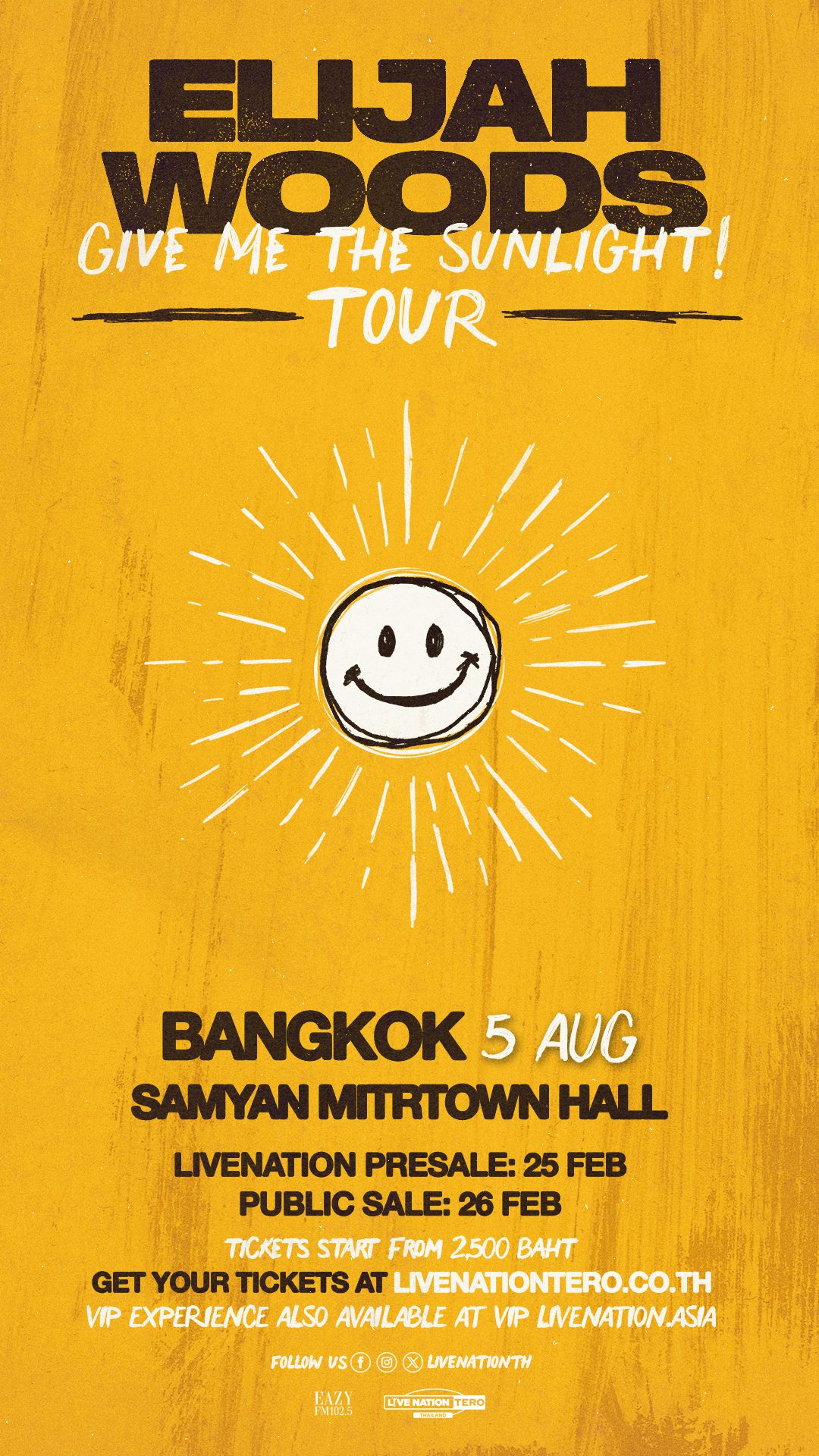 คราวนี้เขามาพร้อมเอเชียทัวร์ครั้งใหม่ในชื่อ “elijah woods: Give Me The Sunlight! Tour” และเลือก กรุงเทพฯ เป็นเมืองเปิดทัวร์เมืองแรกของโซนเอเชีย