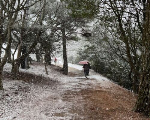 เป้าหมายบนภูเขาในวันนั้นคือ หุบเขาคังคะเค จุดชมวิวระดับท็อปของญี่ปุ่น สูงราว 612 เมตรจากระดับน้ำทะเล อุณหภูมิที่เย็นจัดทำให้หยดฝนกลายเป็นเกล็ดหิมะโปรยลงมาทั่วหุบเขา