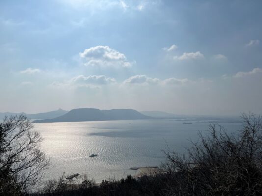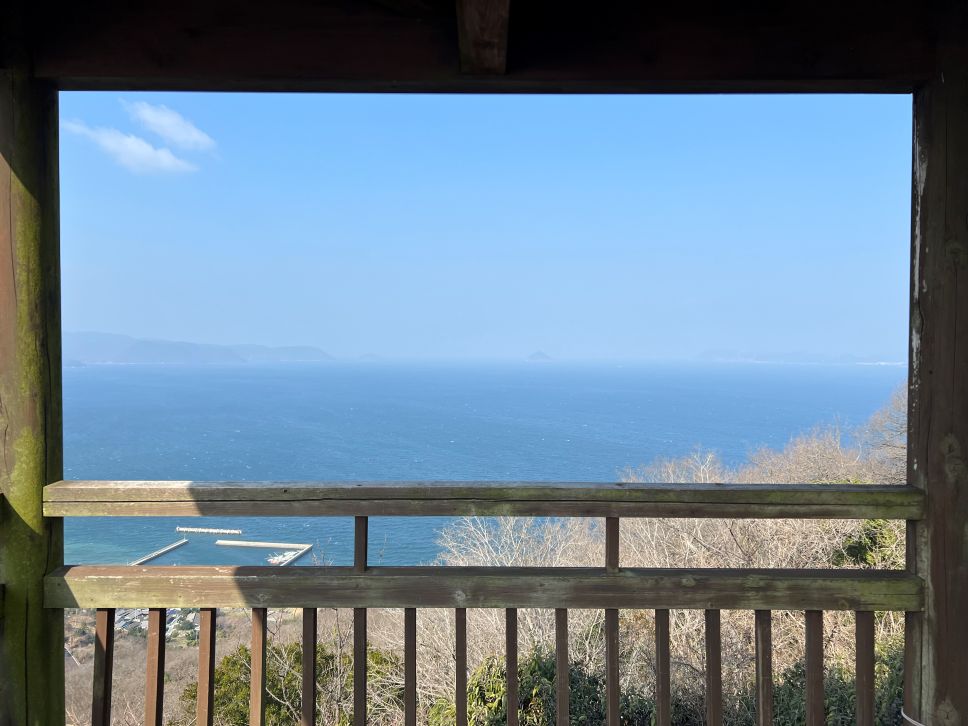 วันนั้นลมที่เกาะแรงใช้ได้ อากาศเย็นจนต้องกอดตัวเองเบาๆ แต่แลกมากับท้องฟ้าใสที่มองเห็นท่าเรือทากามัตสึและสนามกีฬาริมทะเลอยู่ลิบๆ แบบชัดเจน
