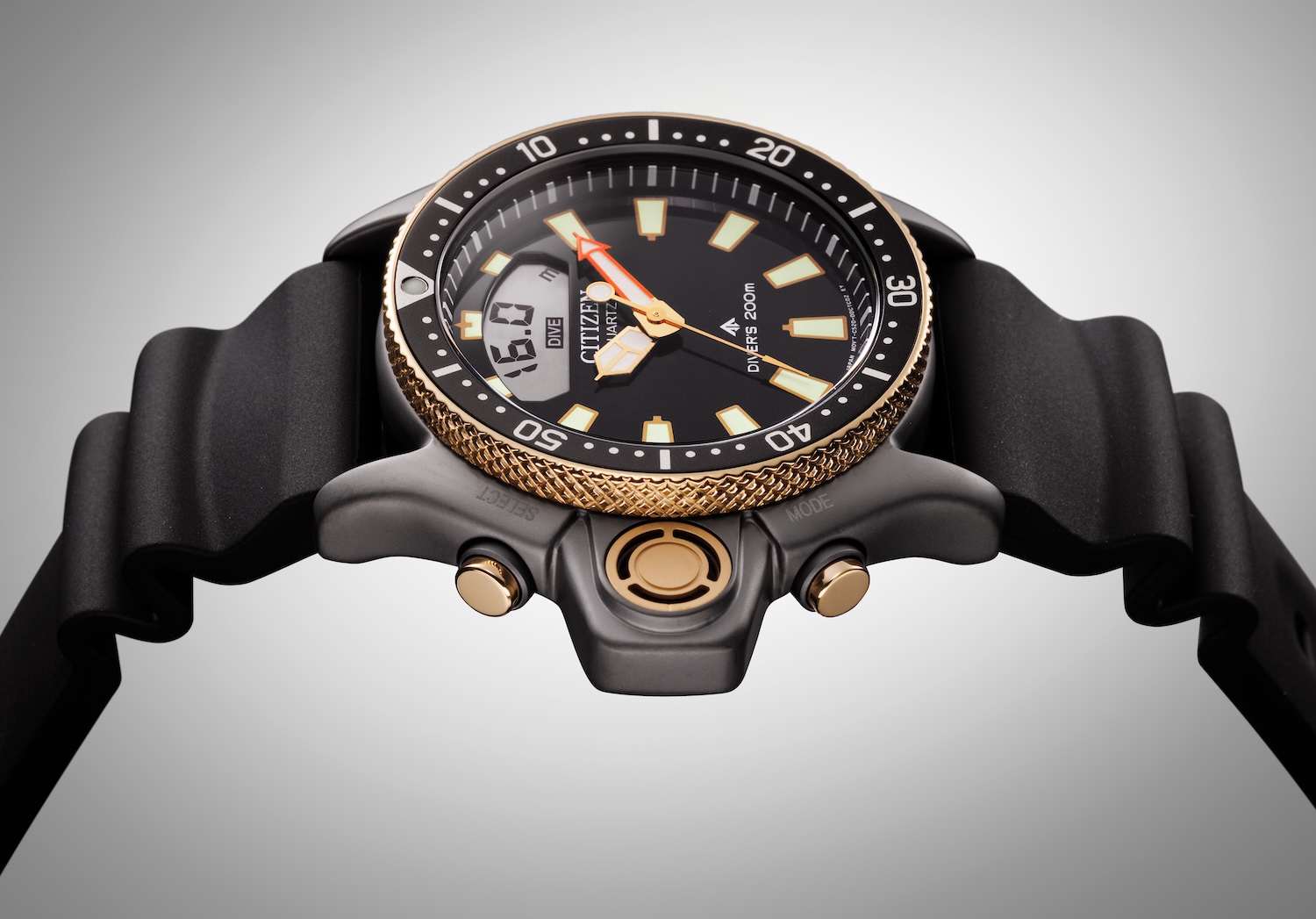 เพิ่มความหรูด้วย ฮาร์ดแวร์โทนสีทอง ทั้งเข็มนาฬิกา กรอบมาร์กเกอร์ ขอบหน้าปัดแบบหยัก เม็ดมะยมหลักที่ตำแหน่งสี่นาฬิกา ปุ่มฟังก์ชันต่างๆ ไปจนถึงส่วนเซ็นเซอร์วัดแรงดันน้ำ