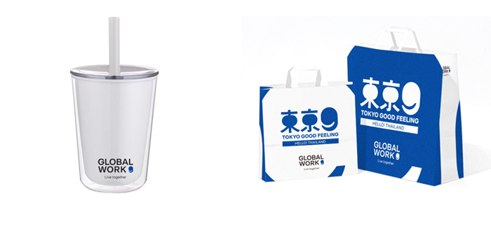 พร้อมกันนั้นยังใช้ สีประจำแบรนด์ และเน้นย้ำอัตลักษณ์สำคัญว่า GLOBAL WORK คือแบรนด์ที่มี รากจากโตเกียว เมืองหลอมรวมแฟชั่น สตรีต และไลฟ์สไตล์ที่หลากหลาย