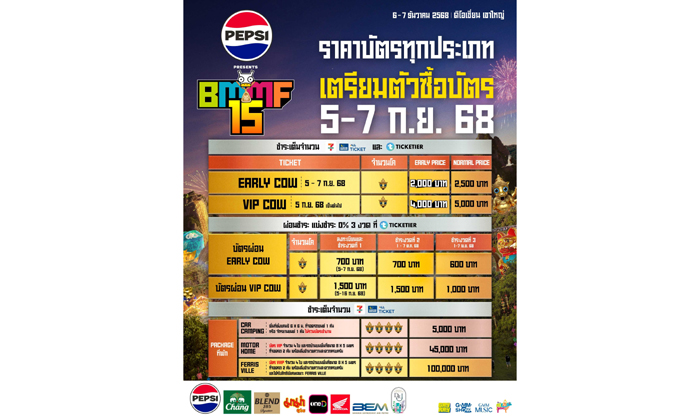 รายละเอียดเรื่องรอบการขายบัตรและราคา มีทั้งแบบ EARLY COW, VIP COW, CAR CAMPING, MOTORHOME และ FERRIS VILLE ให้เลือกตามสไตล์และงบของแต่ละคน แนะนำให้รีบตามช่องทางจำหน่ายอย่างเป็นทางการ เพราะบัตรดีๆ มักหมดไวเสมอในทุกปี