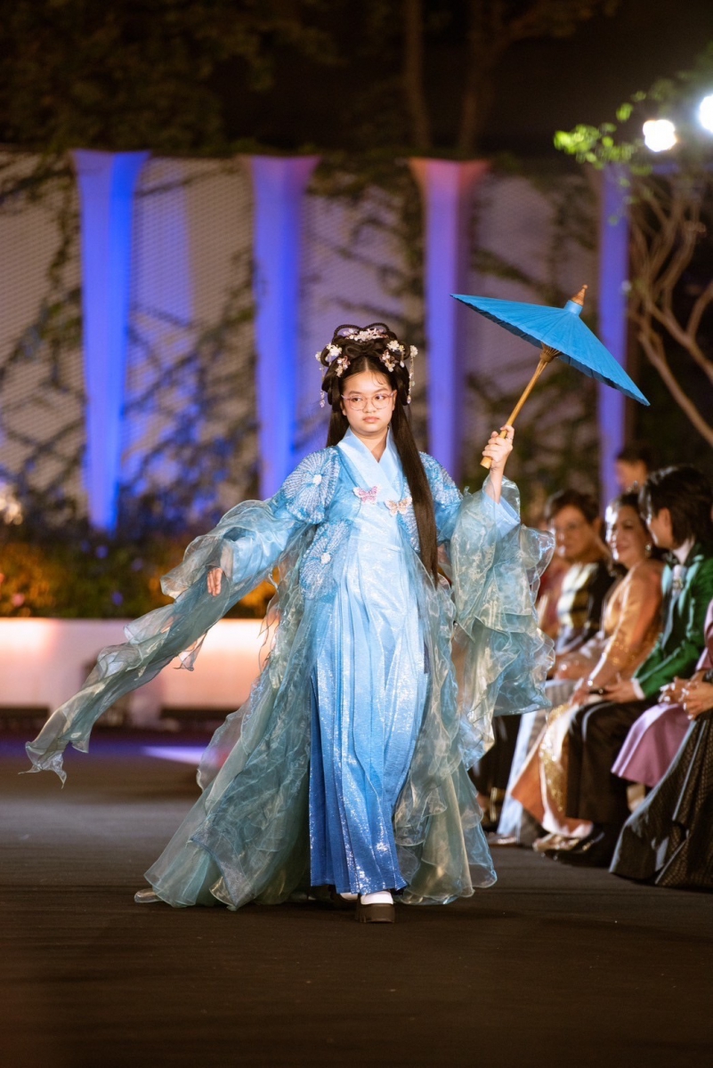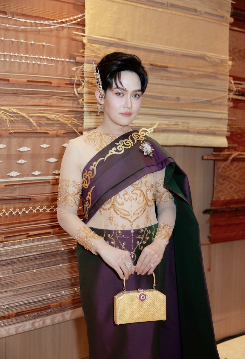 ลุคของชุดออกมาทั้งคลาสสิกและทรงพลัง ให้ความรู้สึกเหมือนตัวละครพีเรียดหลุดออกมาจากหน้าหนังสือแล้วเดินเฉิดฉายบนแคตวอล์ค ด้วยผ้าไทยที่ถูกออกแบบอย่างประณีต