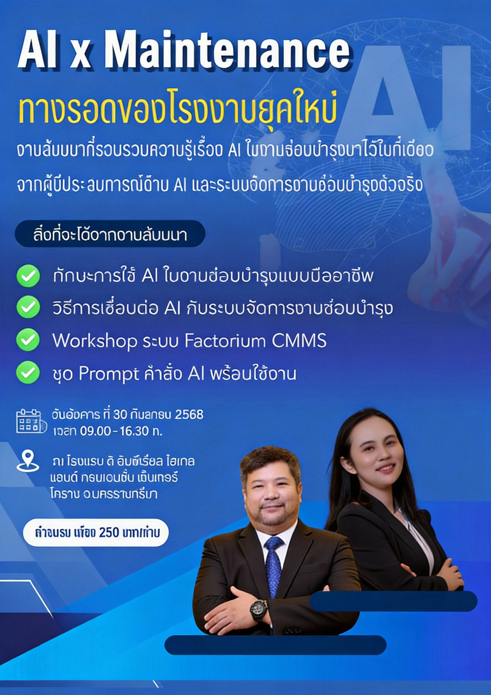 งานนี้เหมาะกับทั้งช่างซ่อมบำรุง วิศวกร และคนทำงานสายอุตสาหกรรมที่อยากอัปสกิลด้าน AI ให้ทันยุค ใครเริ่มก่อน ย่อมมีกำไรกว่าในเกมโรงงานยุคใหม่