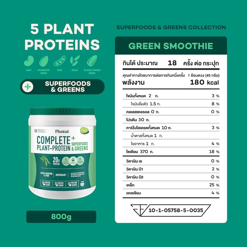 เน้นผสม Superfoods หลายชนิด มีสารต้านอนุมูลอิสระและไฟเบอร์สูง เช่นComplete Plant Protein - Green Smoothie