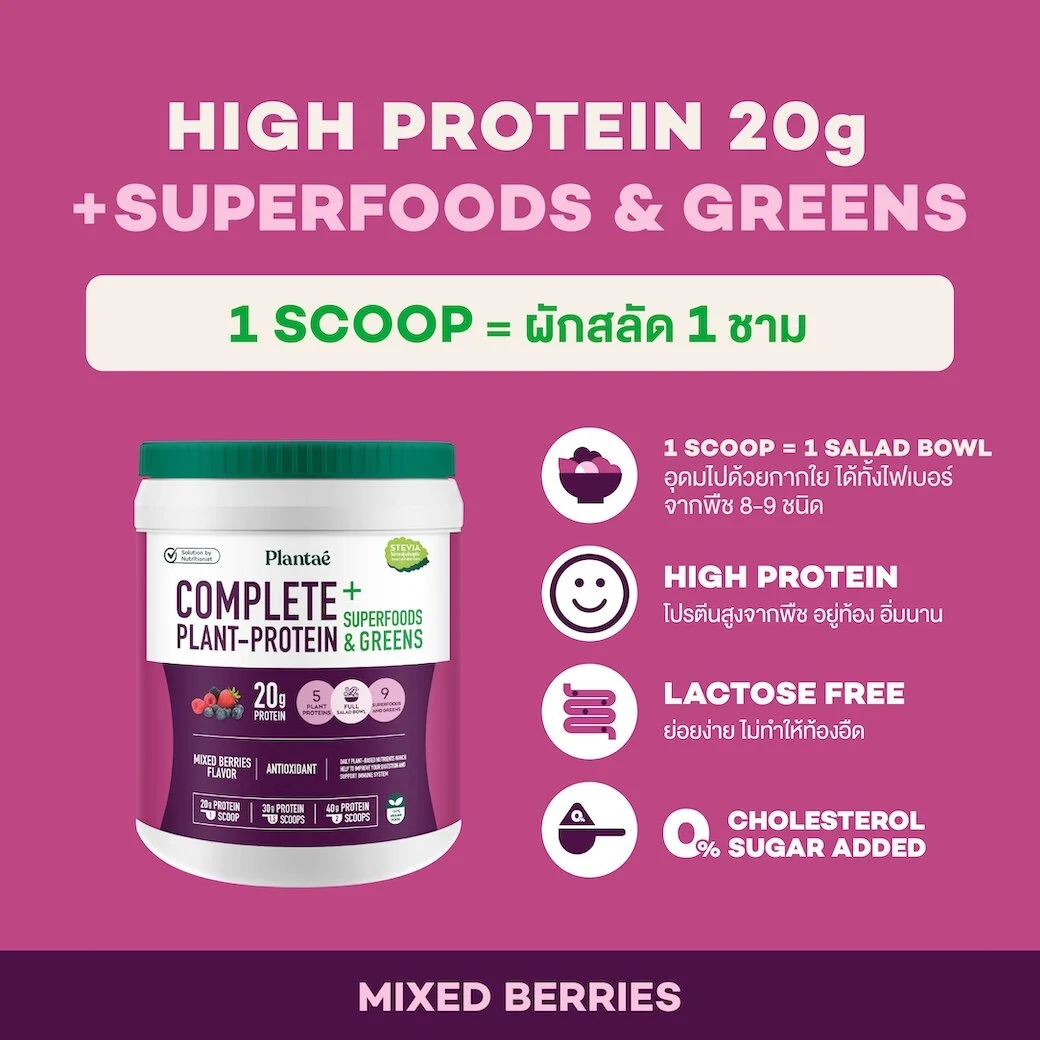 โปรตีนพืชสารต้านอนุมูลอิสระสูง ระบุว่า 1 scoop = ผักสลัดอกไก่ 1 ชามComplete Plant Protein - Mango / Mixed Berries
