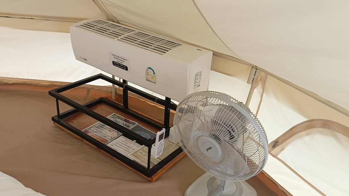 ภายในเต็นท์มีทั้ง แอร์และพัดลม ช่วยกันทำงานแบบดับเครื่องชน ความเย็นคือมาเต็ม เตียงก็นุ่มมาก นอนแล้วไม่อยากลุก