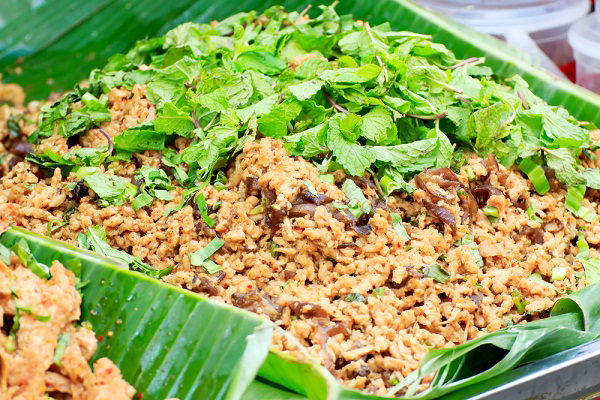 เติมหอมแดง ผักชีฝรั่ง ต้นหอม คลุกเบา ๆ แล้วโรยใบสะระแหน่ด้านบน เสิร์ฟคู่ผักสด