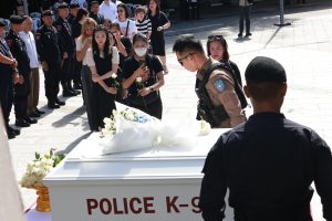 บรรยากาศรายล้อมไปด้วยเจ้าหน้าที่ เพื่อนสุนัขตำรวจ และประชาชนที่ติดตามผลงานของเขามาอย่างต่อเนื่อง ทุกสายตาต่างเต็มไปด้วยความอาลัยและเคารพ