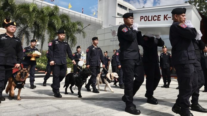 พล.ต.ต.วรวิทย์ ญาณจินดา ผบก.สปพ. ทำหน้าที่เป็นประธานในพิธี ส่งสุนัขตำรวจสีดำ–น้ำตาลเพศผู้ ผู้ทุ่มเทให้กับงานด้านการค้นหาวัตถุระเบิดจนวาระสุดท้ายของชีวิต