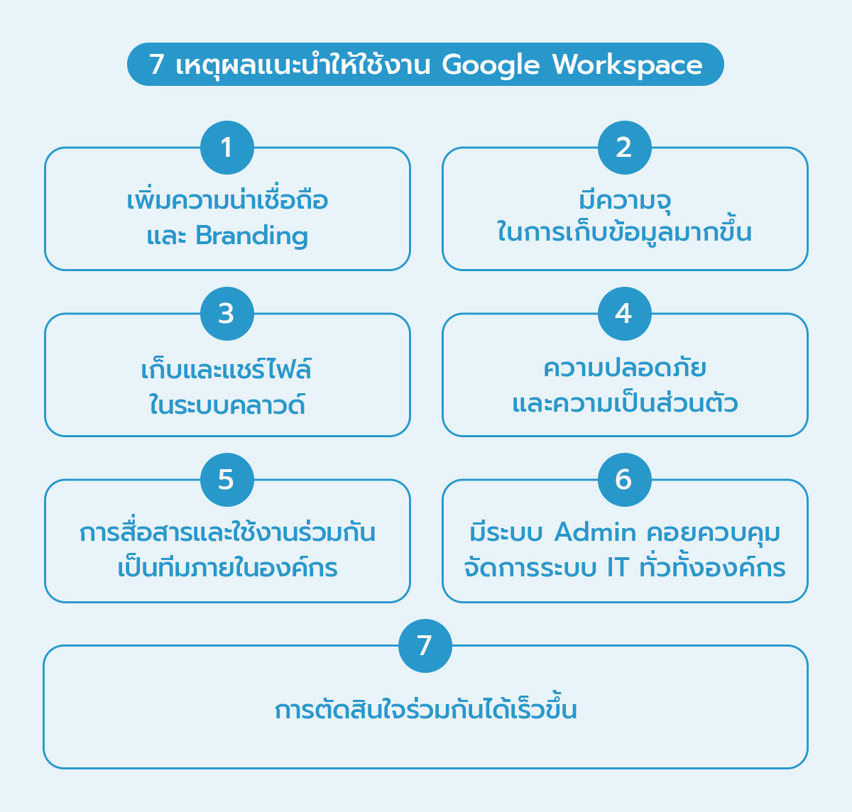 เพื่อให้เห็นภาพชัดเจนว่า Google Workspace ไม่ได้เป็นแค่ “ชุดโปรแกรมจาก Google” แต่เป็นโครงสร้างการทำงานทั้งองค์กร มาดู 7 เหตุผลหลักที่ควรพิจารณาใช้กัน
