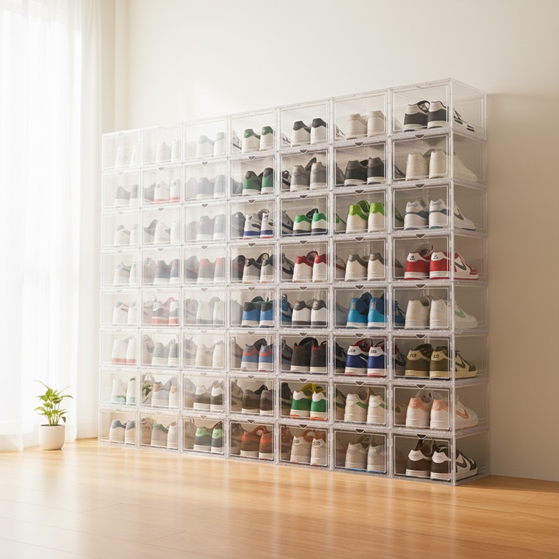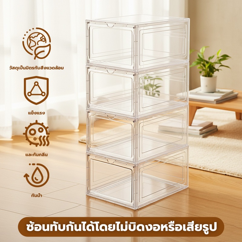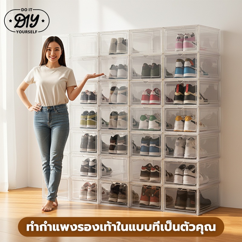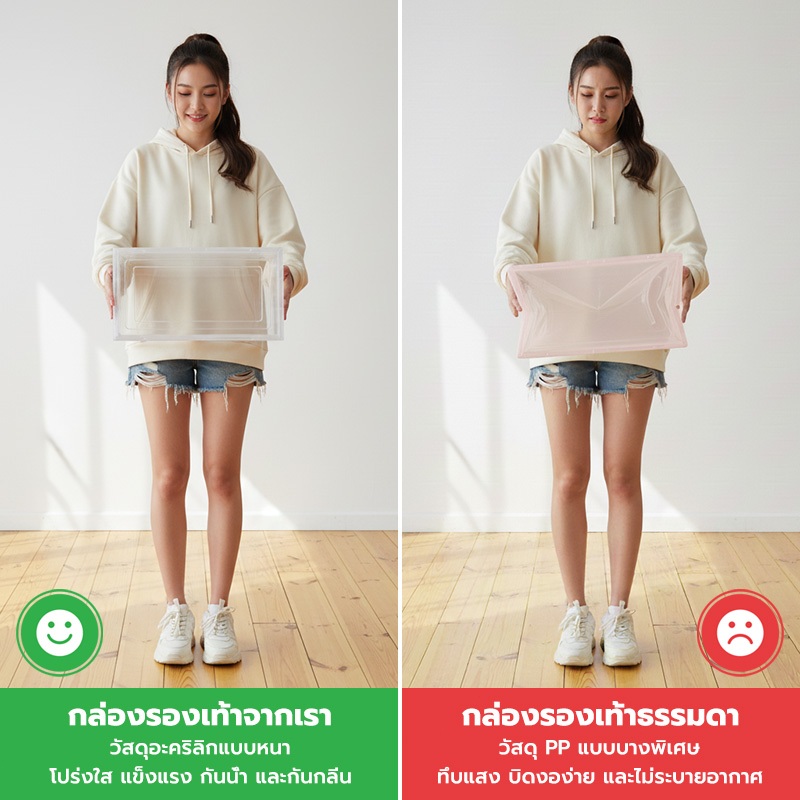ความใสของกล่องช่วยให้เห็นรองเท้าด้านในได้ทันที ลดเวลาการค้นหา และช่วยให้การจัดเรียงรองเท้าเป็นระบบมากขึ้น เหมาะกับคนที่มีรองเท้าหลายคู่ และอยากดูแลรองเท้าให้พร้อมใช้งานอยู่เสมอ
