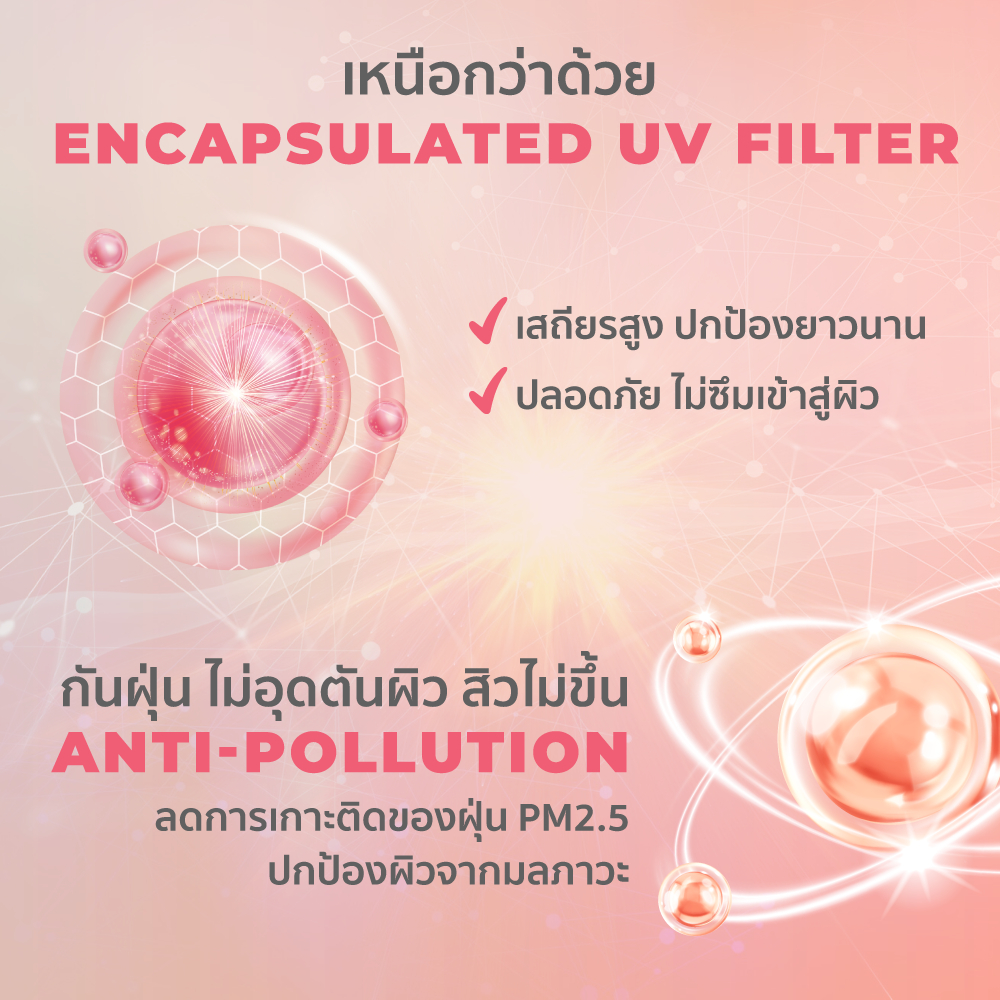 เข้าไว้ด้วยกันในเนื้อสัมผัสเดียว จุดเด่นอยู่ที่เนื้อแบบ Water-based ให้ความรู้สึกบางเบา ซึมง่าย และสบายผิว