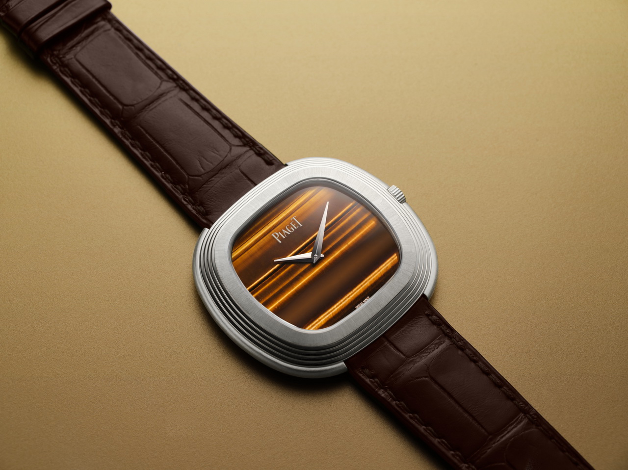 หน้าปัดพลอยตาเสือ: ให้เฉดสีเหลืองอำพันผสมโทนส้มเข้มและน้ำตาล ดูอบอุ่นนุ่มนวล พร้อมลวดลายกราฟิกที่เกิดขึ้นตามธรรมชาติ แต่ถูกเน้นให้โดดเด่นผ่านการเจียระไนอย่างประณีตของช่างผู้เชี่ยวชาญ