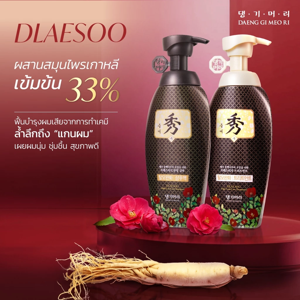 DAENG GI MEO RI DLAESOO Shampoo & Treatment เป็นตัวเลือกที่ตอบโจทย์คนที่ต้องการลดผมร่วงและฟื้นฟูเส้นผมแบบครบวงจร ด้วยจุดเด่นด้านสมุนไพรเกาหลีเข้มข้น การบำรุงลึกถึงหนังศีรษะ และการฟื้นฟูผมเสียจากสารเคมี