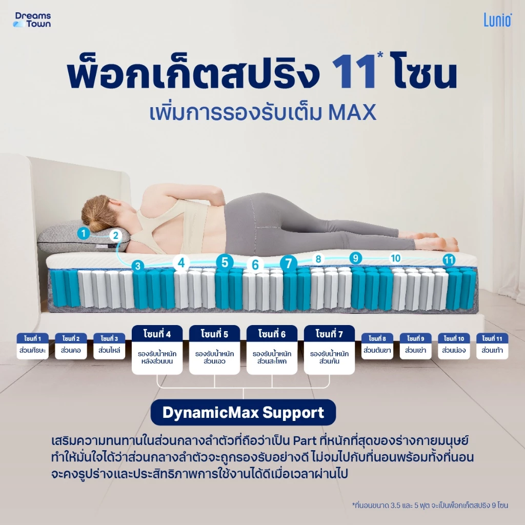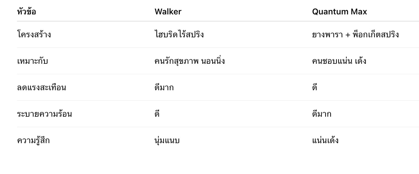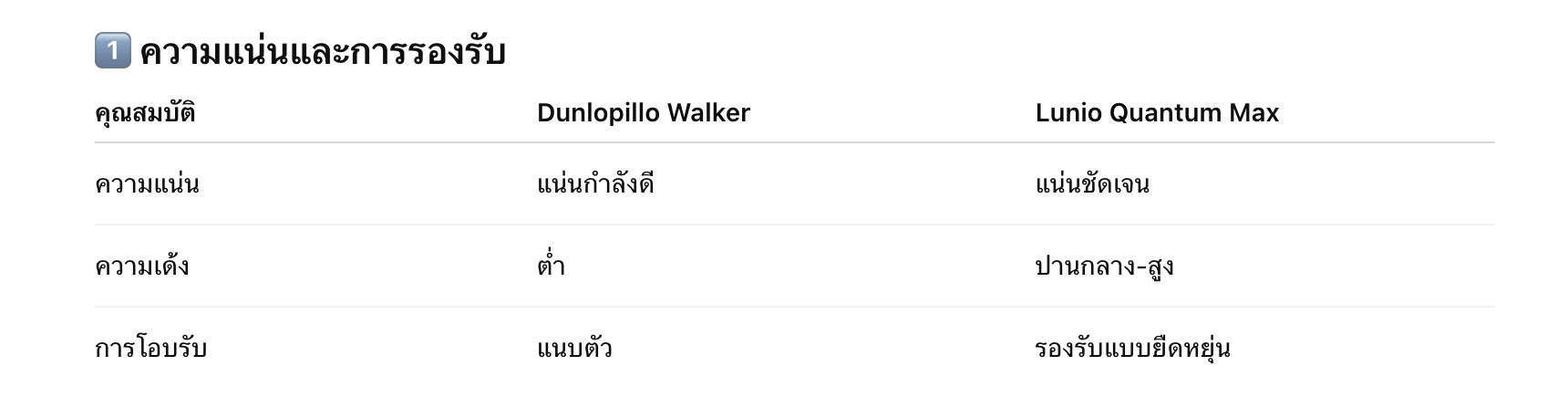 คุณสมบัติDunlopillo WalkerLunio Quantum Maxความแน่นแน่นกำลังดีแน่นชัดเจนความเด้งต่ำปานกลาง-สูงการโอบรับแนบตัวรองรับแบบยืดหยุ่น