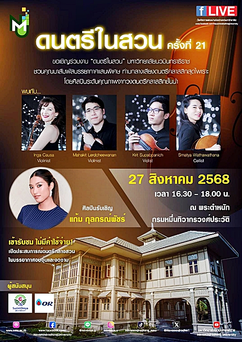 งานนี้จัดโดย มหาวิทยาลัยนวมินทราธิราช เปิดพื้นที่ให้ทุกคนมาดื่มด่ำกับเสียงดนตรีคุณภาพ ท่ามกลางบรรยากาศอบอุ่นเหมือนได้นั่งฟังดนตรีอยู่ในสวนส่วนตัวใจกลางเมือง