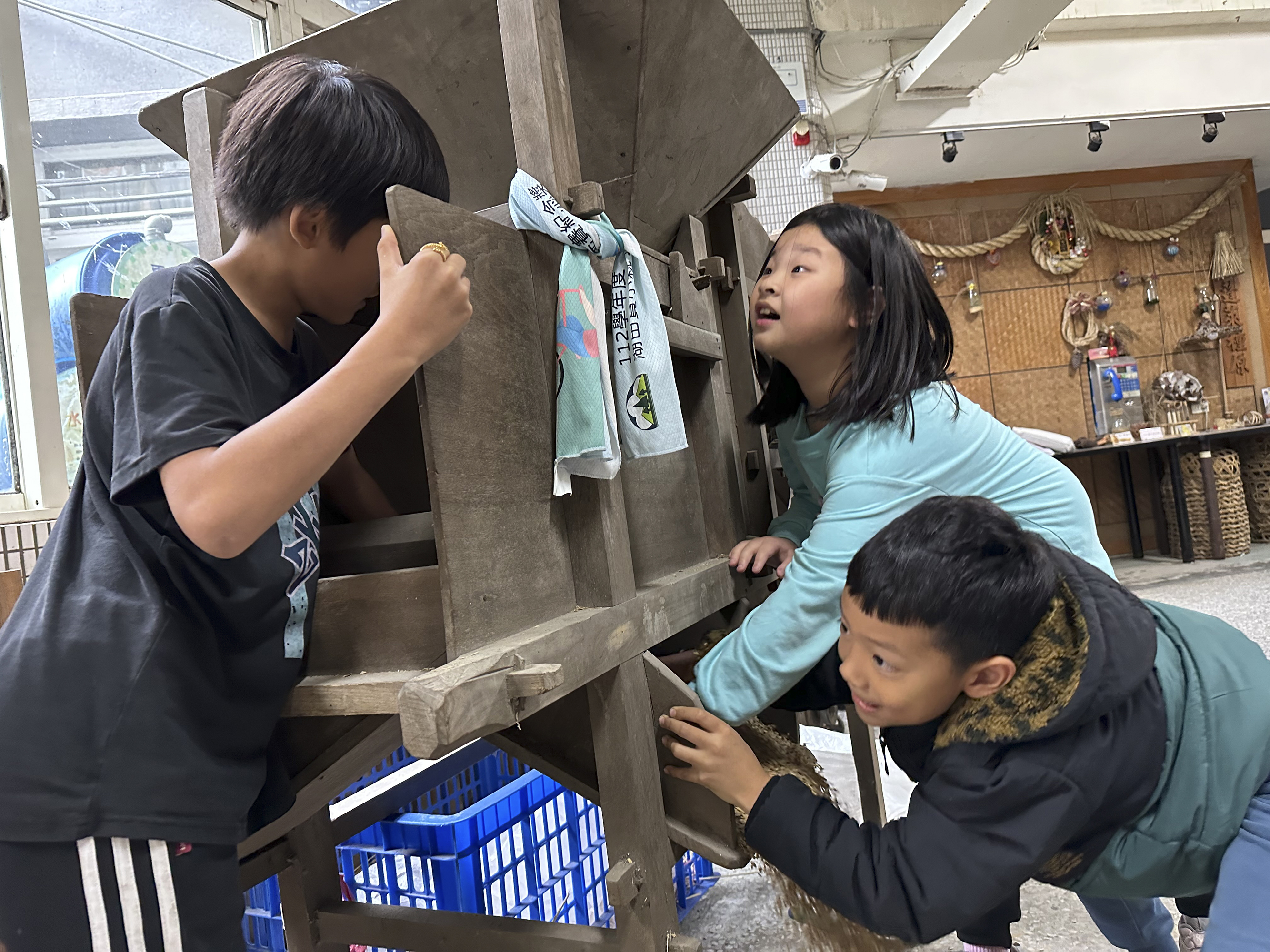 เด็ก ๆ โรงเรียนประถมหูเถียนยังได้ลองใช้เครื่องฝัดข้าวโบราณที่หาดูยาก ทำให้เรื่องข้าวไม่ใช่อดีตที่อยู่แค่ในหนังสือเรียน แต่จับต้องได้ด้วยมือจริง ๆ