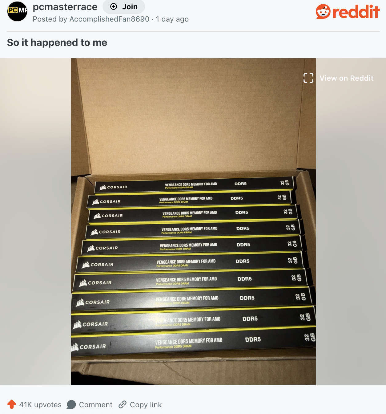 กรณีผู้ใช้ Reddit ที่สั่ง Corsair Vengeance 32GB DDR5 ราคา 300 ดอลลาร์ แต่ได้มา 10 โมดูลเต็มกล่อง เป็นตัวอย่างชัดเจนของความผิดพลาดในระบบคลังสินค้าที่กลายเป็นโชคดีมหาศาลของผู้ซื้อ