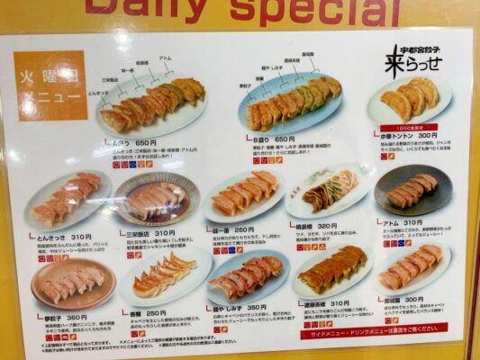 เกี๊ยวซ่าของอุตสึโนะมิยะมีเอกลักษณ์ตรงที่สูตรจะเน้นผักเป็นหลัก เช่น