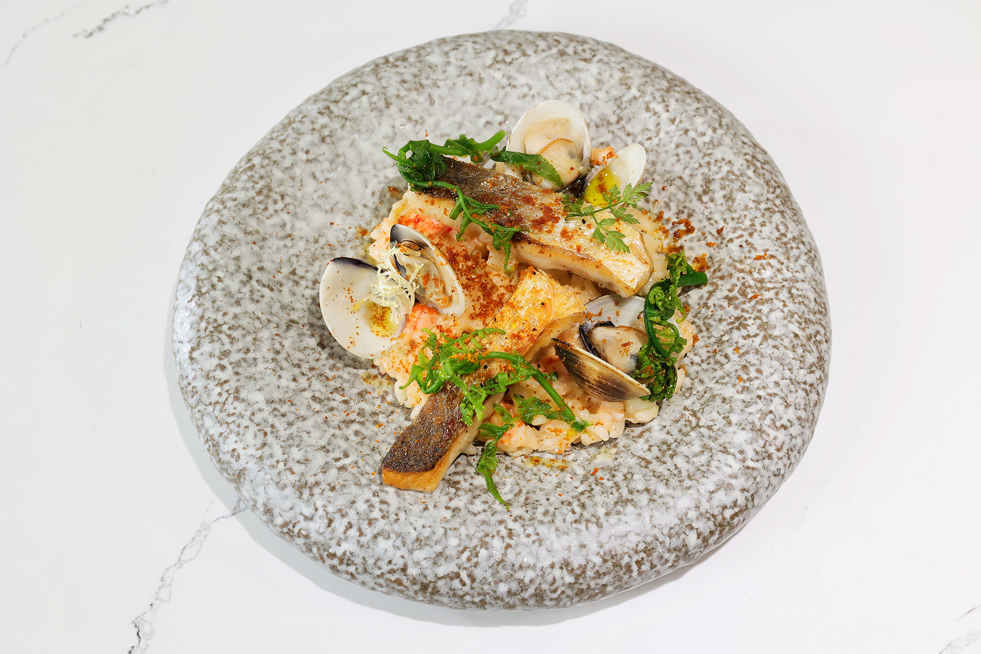 ในจังหวะสุดท้าย ปลากุเลา ไข่ปลากระบอก และผักกูดถูกใส่ลงไป กลายเป็นจานรีซอตโตทะเลที่ใช้แต่วัตถุดิบจากไต้หวันแท้ ๆ และพระเอกของจานนี้ก็คือ ข้าวฮัวเหลียน 26 ที่ให้สัมผัส นุ่ม หนึบ เคี้ยวแล้วหยุดไม่ได้