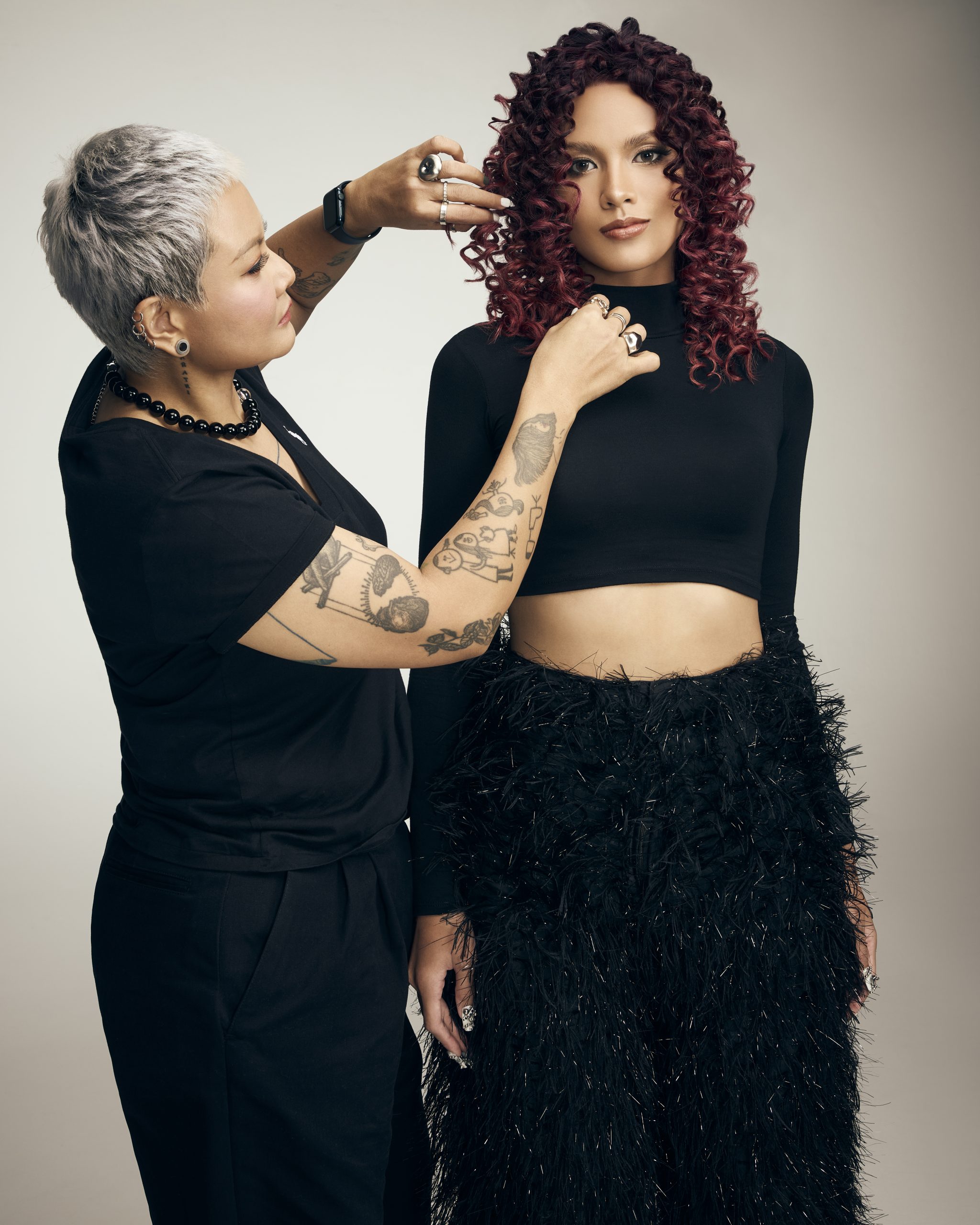 สีม่วงและชมพูถูกนำมาเล่นให้เกิดมิติบนเส้นผมลอนฟู จนกลายเป็นลุคที่
