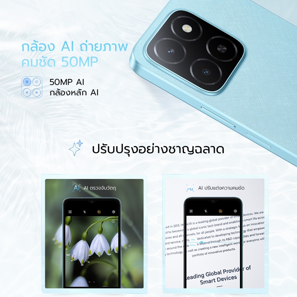 สำหรับกล้อง HONOR X5b Plus ให้กล้องหลังหลักความละเอียด 50MP ร่วมกับเซนเซอร์ Depth 0.08MP เพื่อช่วยแยกฉากหลังและสร้างโบเก้ได้เป็นธรรมชาติ จุดที่น่าสนใจของกล้อง 50MP คือความคมชัดที่เก็บรายละเอียดได้ดีในหลายสภาพแสง เหมาะกับการถ่ายภาพทั่วไป เช่น วิว อาหาร หรือภาพบุคคลแบบไม่ต้องตั้งค่าเยอะ
