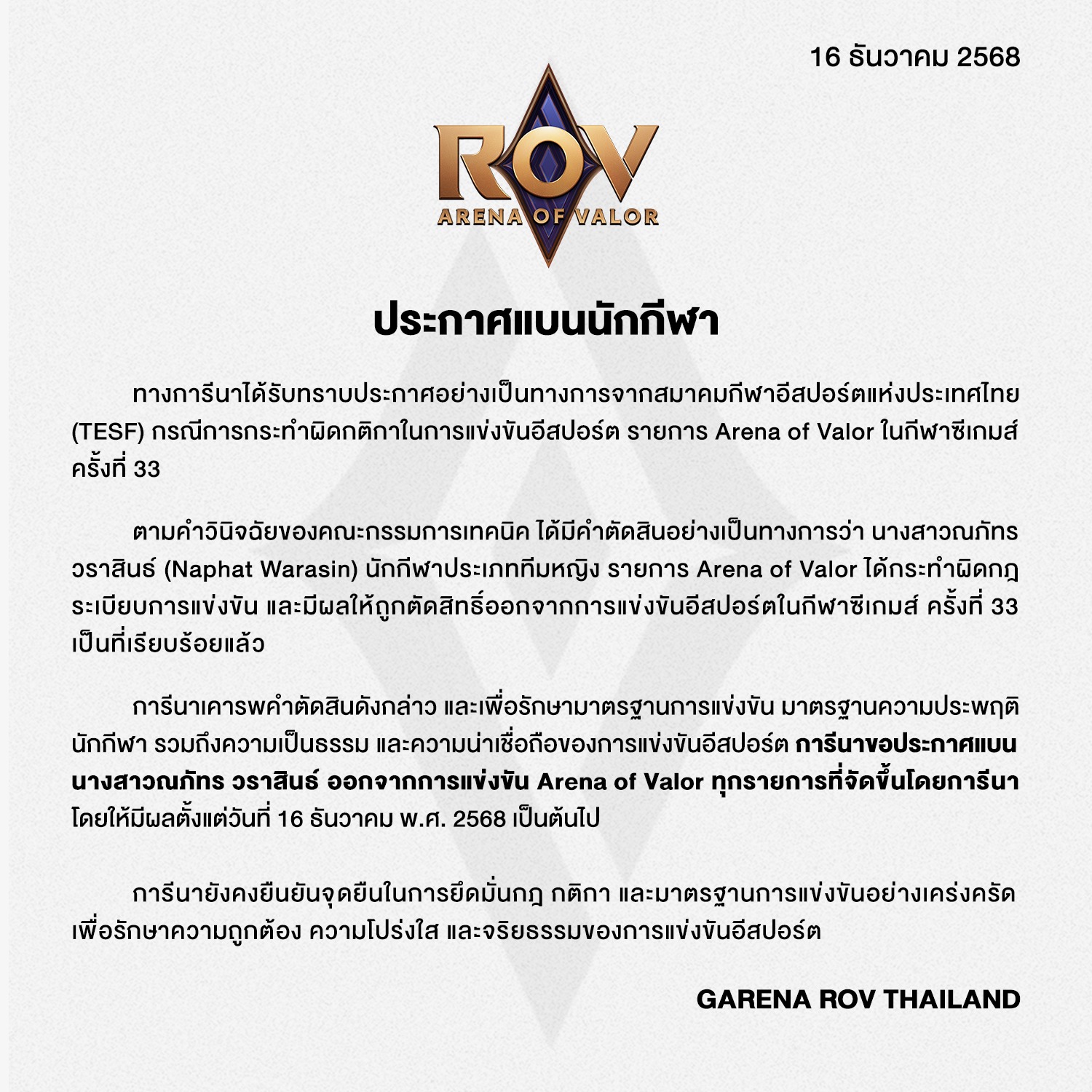 ในเวลาไล่เลี่ยกัน Garena RoV Thailand ก็ออกประกาศแบน Tokyogurl เช่นกัน ยิ่งตอกย้ำว่านี่ไม่ใช่เรื่องเล็ก และไม่มีใครอยู่เหนือกฎ