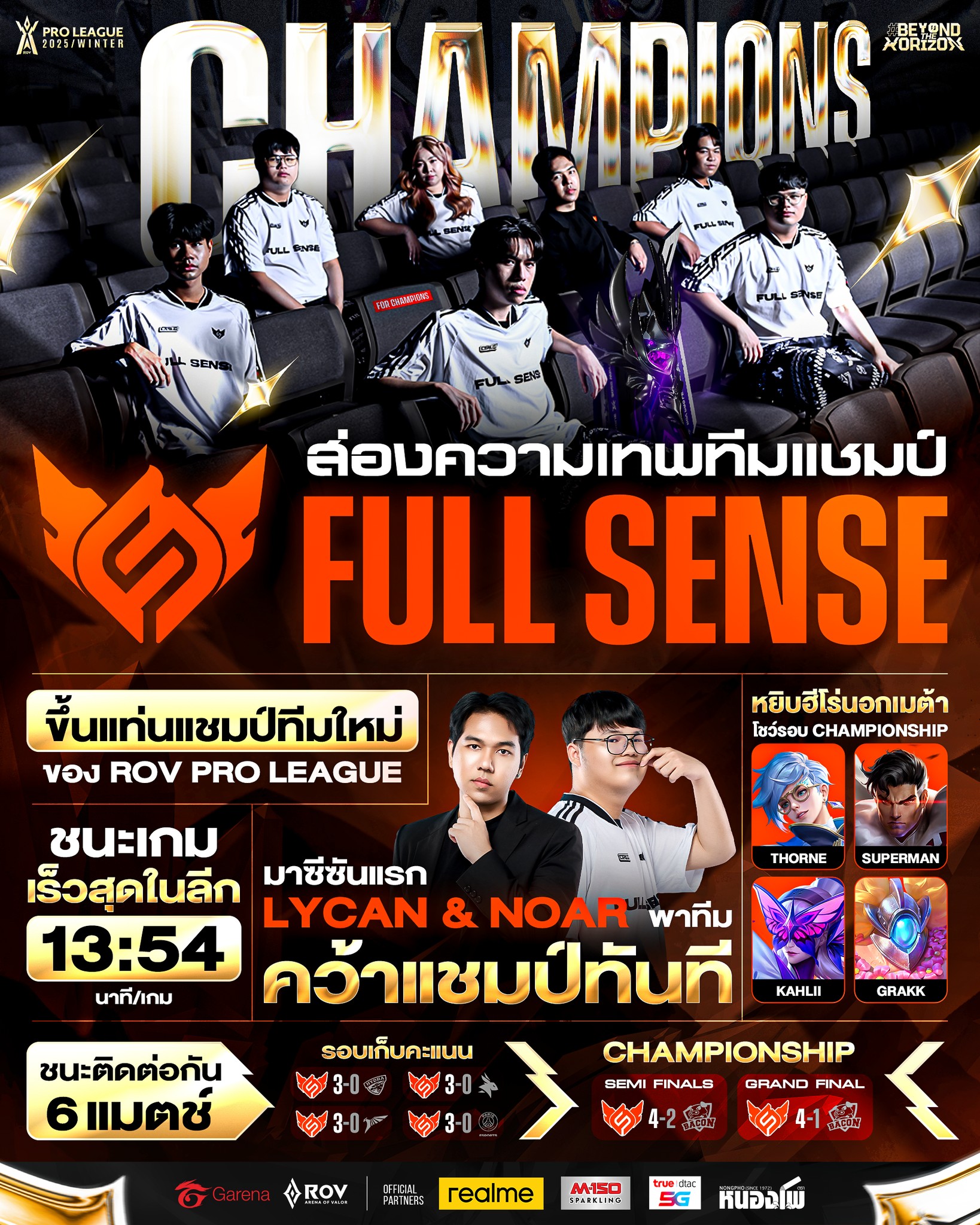 หลังจากการแข่งขันที่เข้มข้นและดุเดือดยาวนานถึงหลายสัปดาห์ ล่าสุดในศึก RPL2025 Winter ที่มีธีมว่า “Beyond The Horizon” พบว่า Full Sense ได้สร้างประวัติศาสตร์หน้าใหม่ให้กับวงการเมื่อพวกเขา คว้าแชมป์ครั้งแรกในไทย ได้สำเร็จ พร้อมรับถ้วยรางวัลอันทรงเกียรติและเงินรางวัลกว่า 6,000,000 บาท มาเป็นของทีมอย่างสมเกียรติ