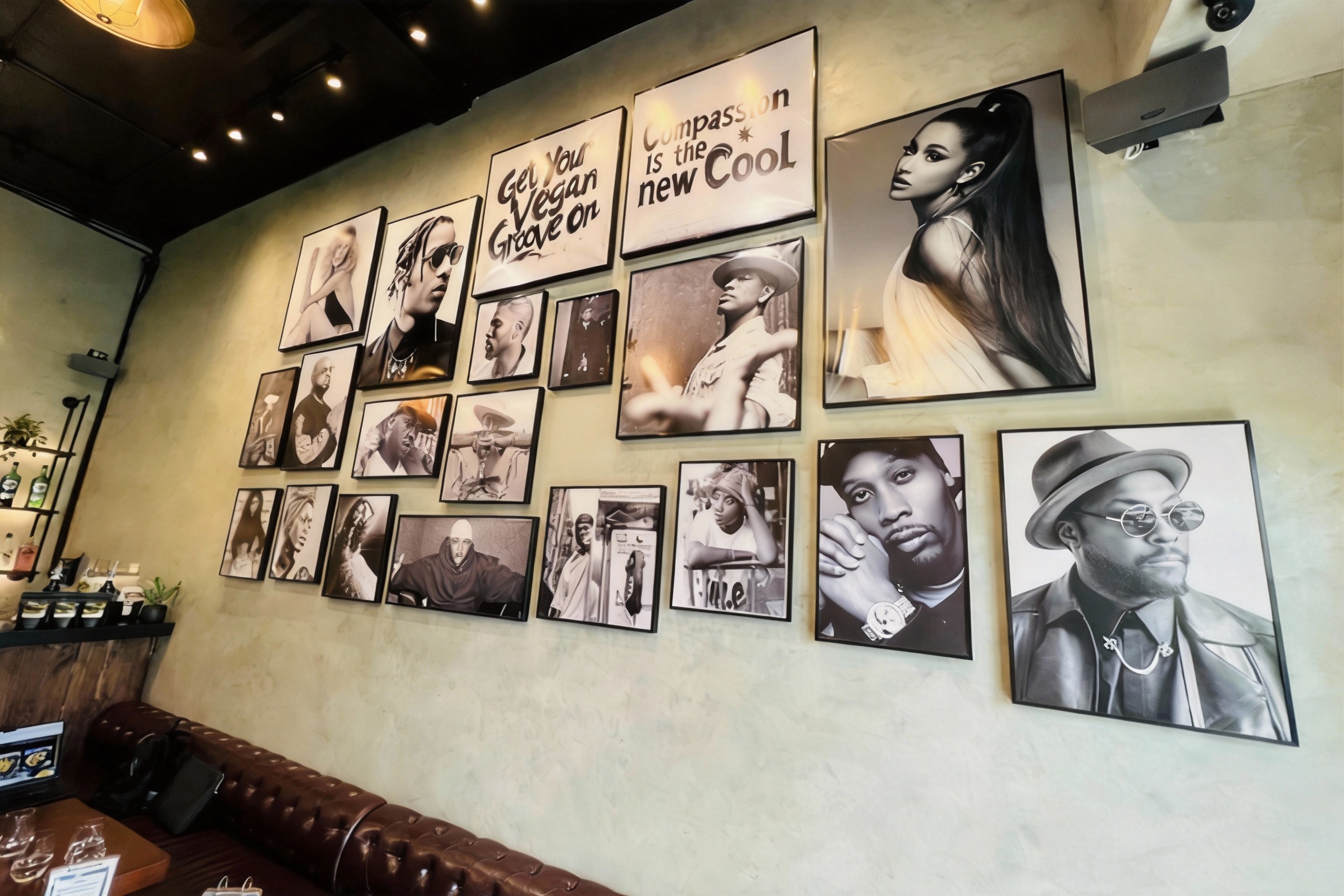 บนผนังร้านเต็มไปด้วยรูปและเรื่องราวของศิลปินฮิปฮอปที่เป็นวีแกนและเป็นนักรณรงค์เพื่อสังคม แนวคิดนี้ช่วยให้คำว่า “วีแกน” กลายเป็นภาพของ