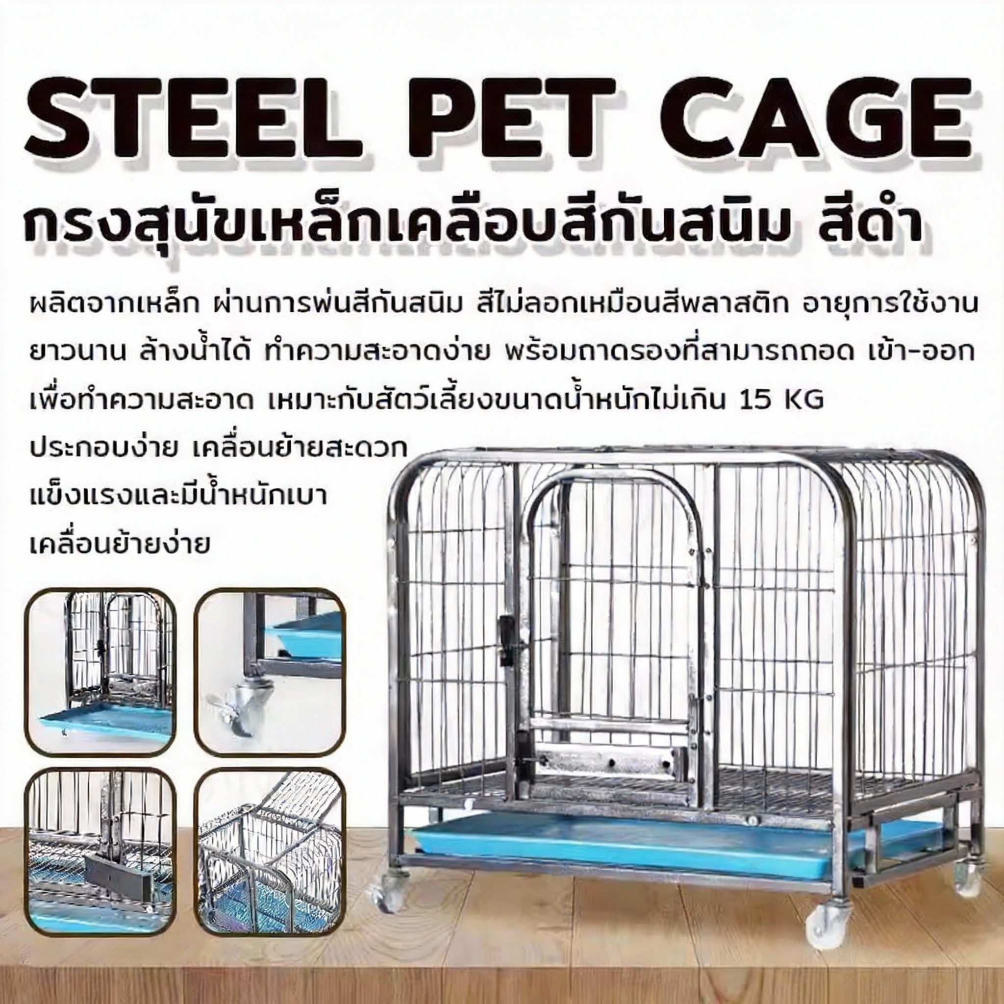 จุดสำคัญคือการเคลือบกันสนิม เพราะกรงต้องเจอน้ำ ความชื้น และปัสสาวะสัตว์เลี้ยง การเคลือบดี ๆ ช่วยให้ไม่ผุเร็วและทำความสะอาดได้ง่ายกว่าโลหะดิบ