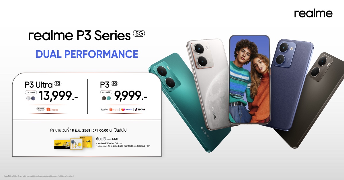 ซีรีส์นี้มีด้วยกัน 2 รุ่นคือ realme P3 Ultra 5G และ realme P3 5G ชูจุดเด่นแบบชัด ๆ ว่าเป็นสมาร์ตโฟนเกมมิ่งระดับกลางสาย Dual Performance ที่ให้ทั้งพลังและความคุ้มค่าแบบเกินหน้าเกินตาคู่แข่งในเซกเมนต์เดียวกัน