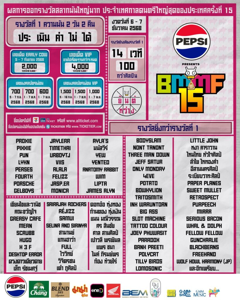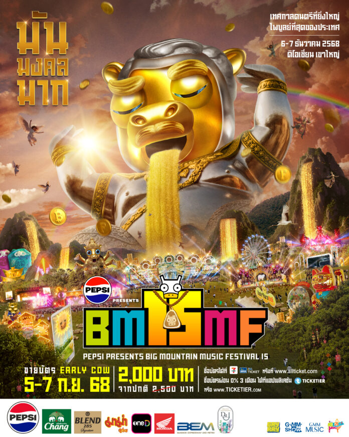 งานจัดขึ้นในวันเสาร์ที่ 6 และวันอาทิตย์ที่ 7 ธันวาคม 2568 ณ ดิ โอเชียน เขาใหญ่ กับเทศกาล “Pepsi presents Big Mountain Music Festival ครั้งที่ 15” ผลงานการสร้างสรรค์ของทีมผู้จัดมากประสบการณ์อย่าง “GAYRAY” ภายใต้ GMM SHOW ที่แฟนๆ มั่นใจได้เลยว่าบรรยากาศ ยิ่งใหญ่ สนุก และอบอุ่นใจตามสไตล์บิ๊กเมาน์เท่นแน่นอน