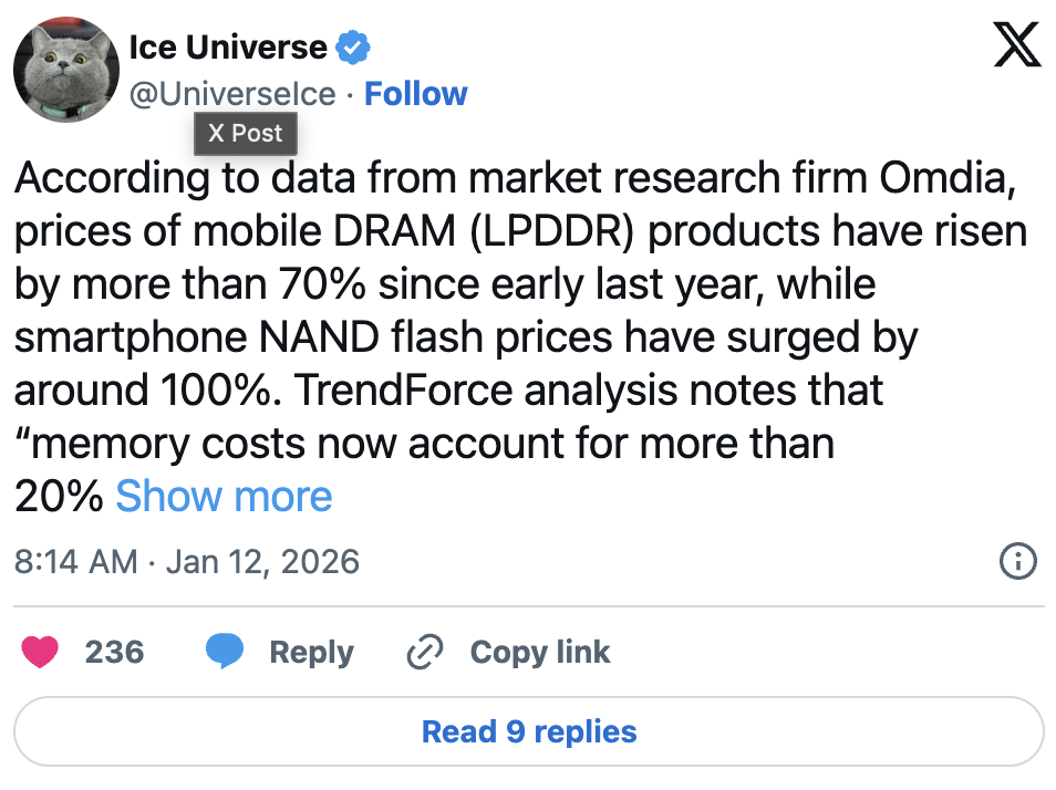 ข้อมูลจากบริษัทวิจัยตลาดระบุว่า ราคา LPDDR RAM สำหรับสมาร์ตโฟน ปรับขึ้นมากกว่า 70% เมื่อเทียบกับช่วงก่อนหน้า ขณะที่ต้นทุนของ NAND Flash ซึ่งใช้เป็นหน่วยความจำภายในเครื่อง เพิ่มขึ้นมากกว่า 100%