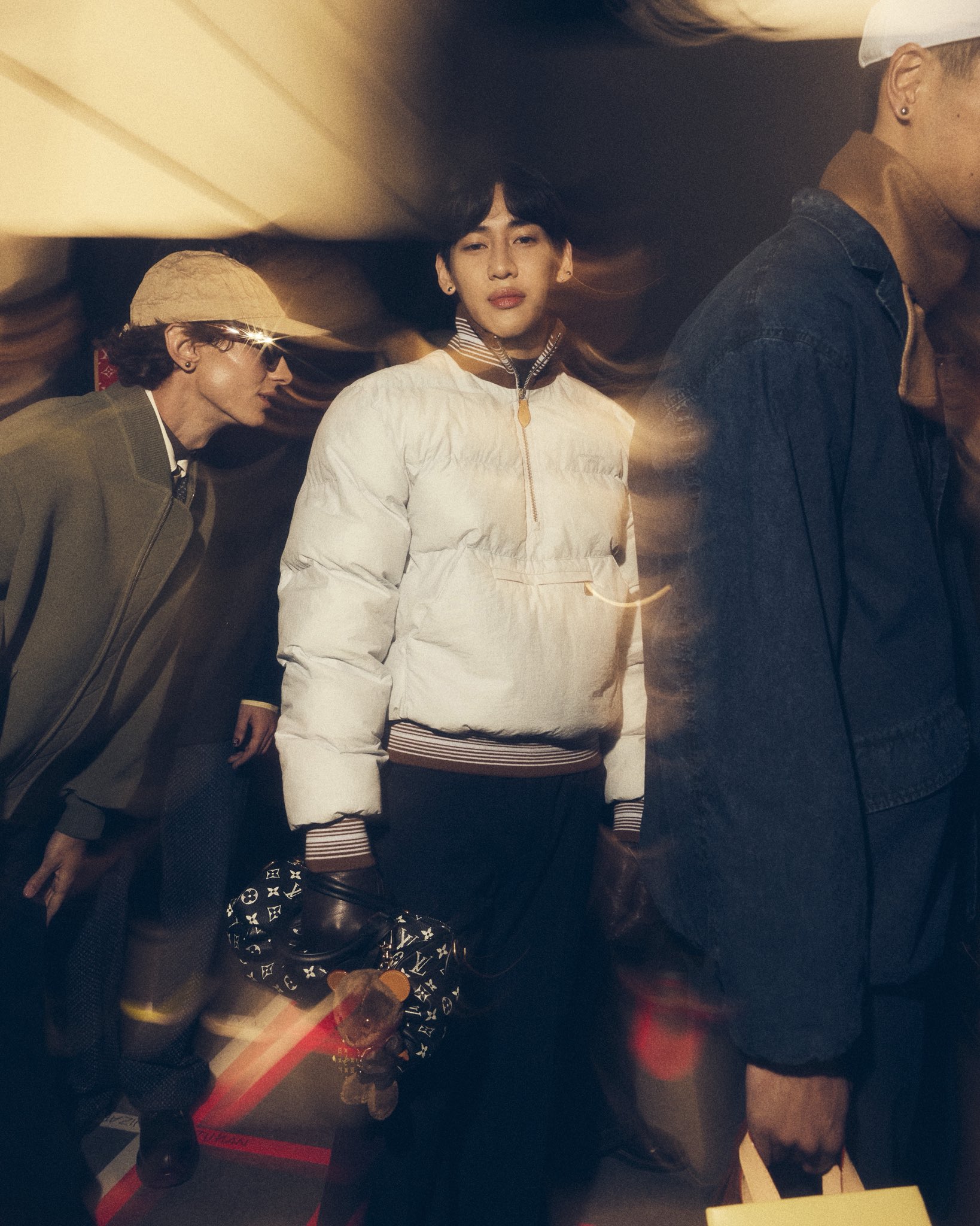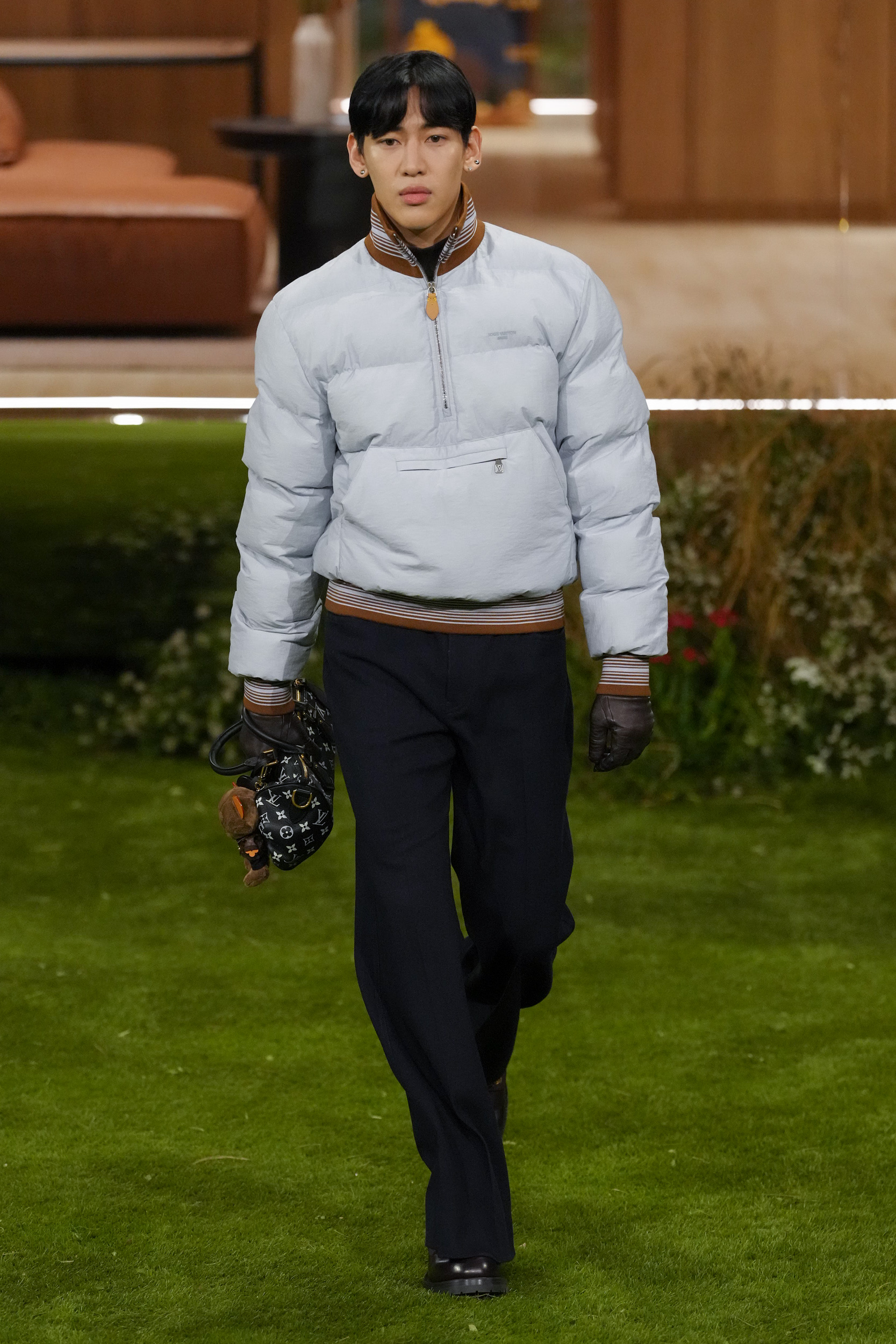 ลุคนี้ถูกบาลานซ์ด้วย กางเกงทรงสลิมโทนเข้ม ที่ดึงความหรูและความสุขุมเข้ามาเสริม พร้อมด้วย ถุงมือหนัง และ กระเป๋าโมโนแกรมดีไซน์ล่าสุด ที่ทำหน้าที่เป็นจุดโฟกัสสำคัญของลุคโดยรวม ทั้งหมดนี้หลอมรวมกันเป็นภาพของผู้ชายที่ดูร่วมสมัย เท่แบบไม่พยายาม และมีความแพงที่เข้าถึงได้