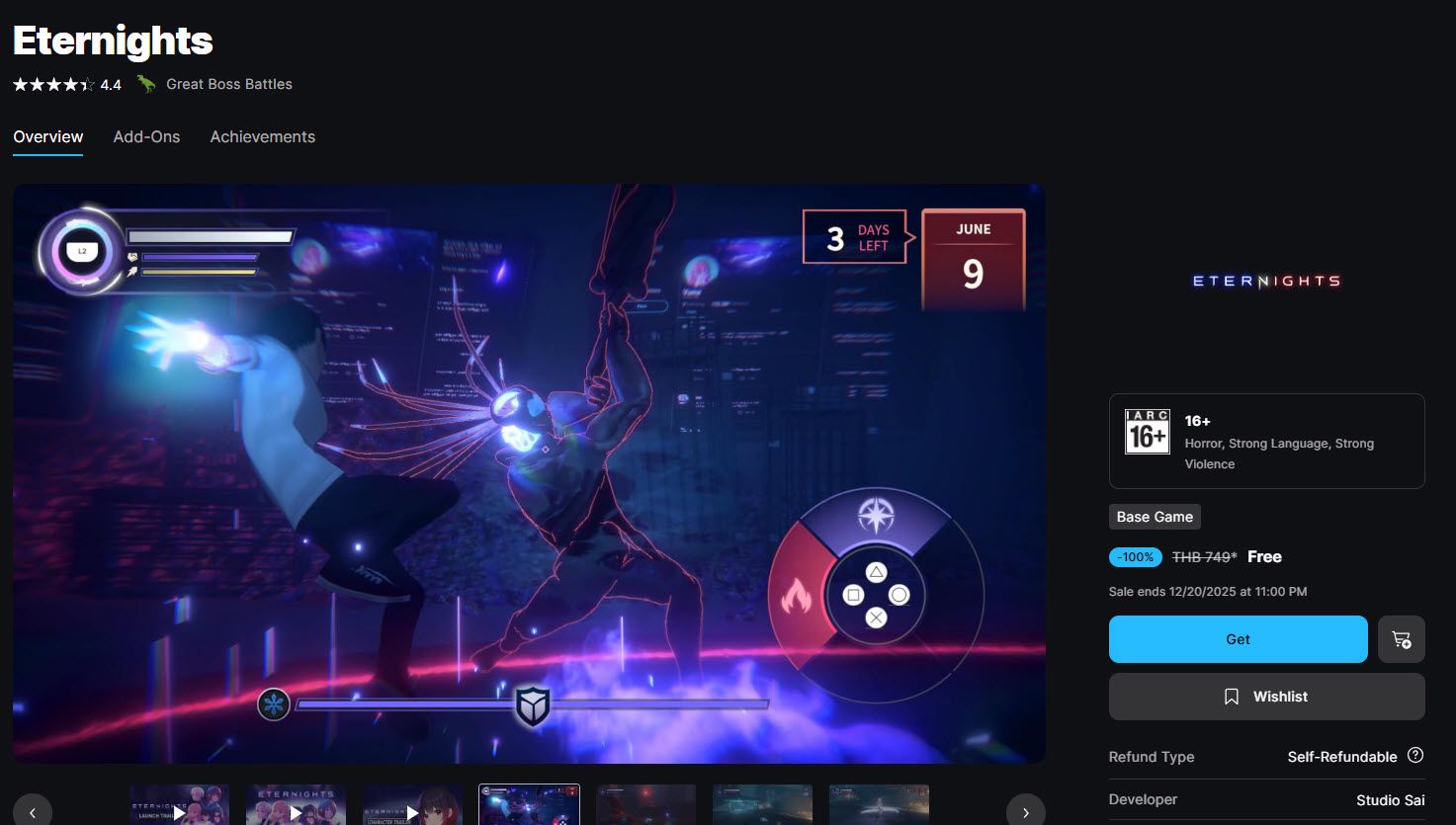 ทาง Epic Games Store ได้นำเกม Eternights มาแจกฟรีให้ผู้เล่นได้กดรับไปเล่นแบบถาวร โดยเปิดให้โหลดฟรีถึงเวลา 23.00 น. ของวันที่ 20 ธันวาคม 2566 เท่านั้น หลังจากนั้นเกมจะกลับไปเป็นเกมราคาปกติทันที