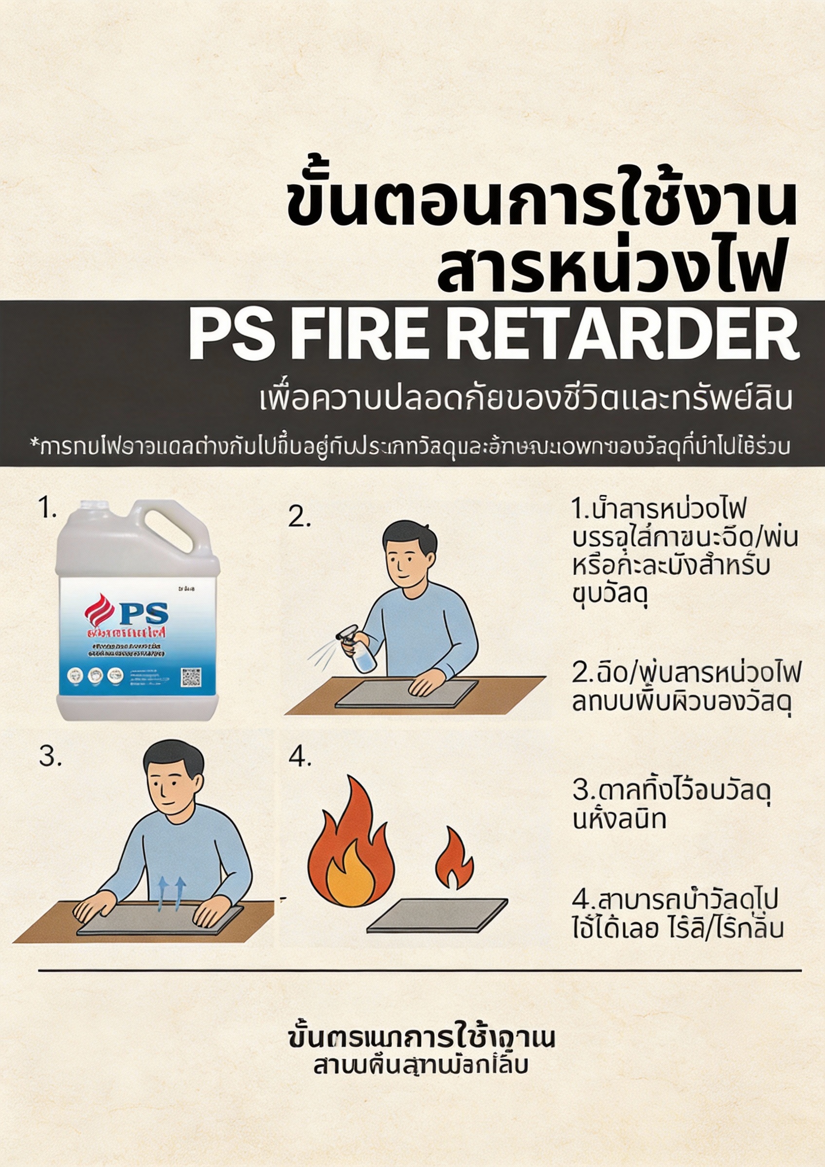 เมื่อฉีดหรือพ่น PS Fire Retarder ลงบนพื้นผิวของวัสดุ น้ำยาจะซึมและเกาะตัวอยู่ในเนื้อวัตถุ เมื่อโดนความร้อนหรือเปลวไฟ สารจะเปลี่ยนสภาพเป็นชั้น Char สีดำ เคลือบผิวเอาไว้