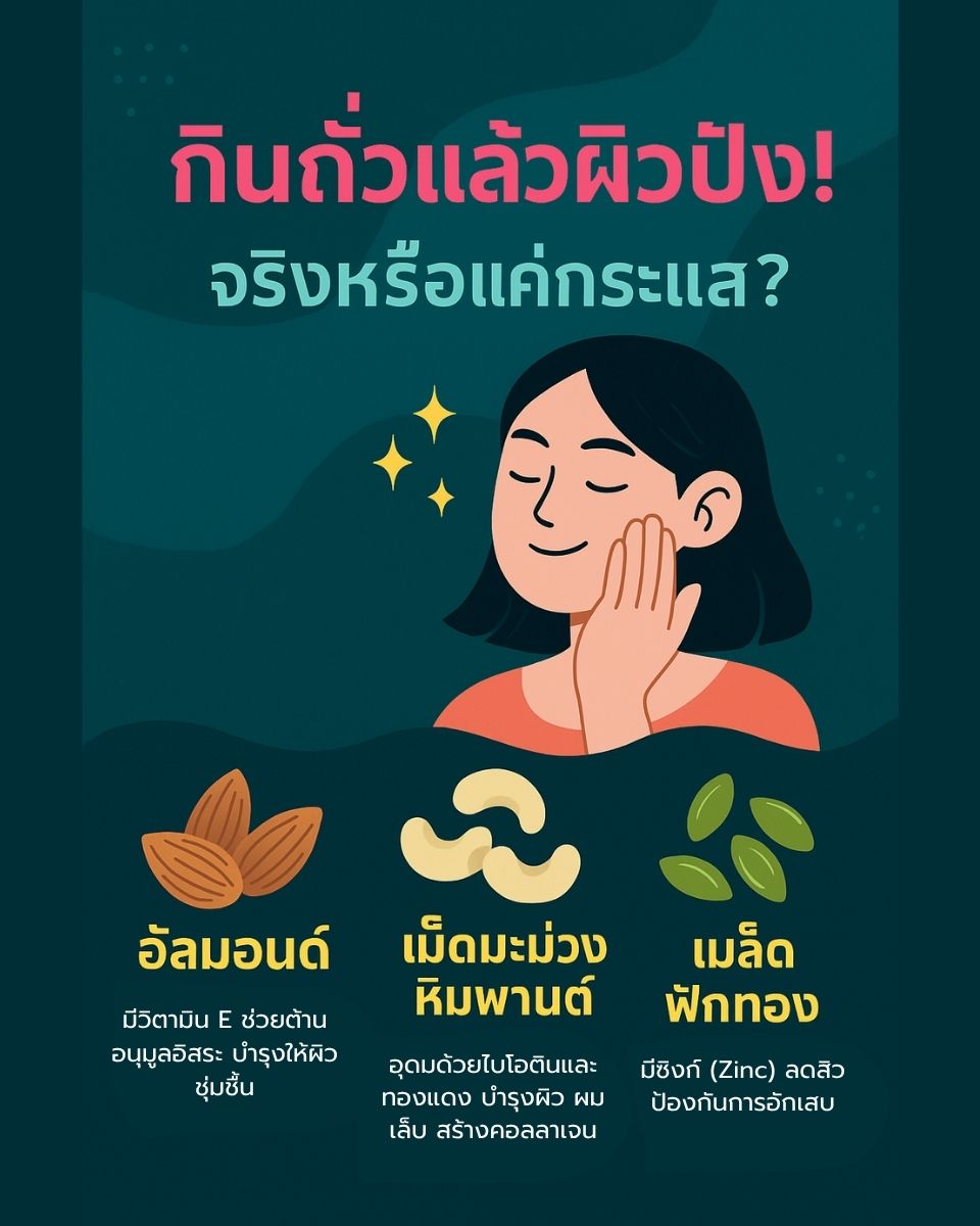 ถ้าไม่อยากพึ่งแต่คลินิกหรือคอร์สทรีตเมนต์แพงๆ ลองหันมาเพิ่ม “ถั่วสายสกินแคร์” อย่างอัลมอนด์ เม็ดมะม่วงหิมพานต์ และเมล็ดฟักทองเข้าไปในมื้ออาหารประจำวัน