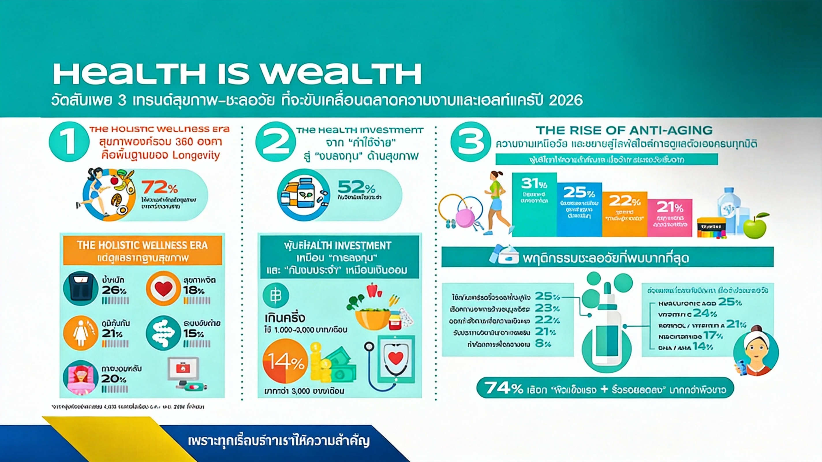 คนไทยไม่ได้มองสุขภาพว่าเป็นแค่เรื่องรักษาเวลาเจ็บป่วยอีกต่อไป แต่เริ่มมองว่าเป็น การลงทุน (Investment) ที่ต้องจัดงบ ดูแลต่อเนื่อง และให้ความสำคัญไม่แพ้ค่าใช้จ่ายด้านอื่นในชีวิตประจำวัน